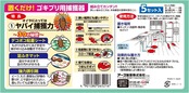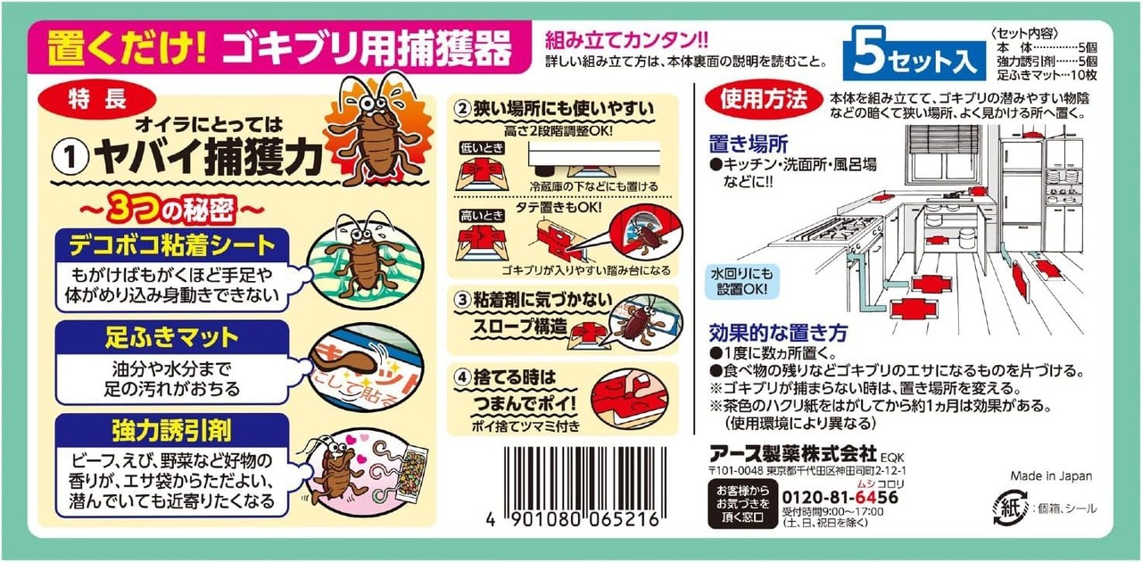 ●ヤバイ捕獲力 ●置くだけ、ゴキブリ用捕獲器 ●組み立てカンタン。(詳しい組み立て方は、本体裏面の説明を読むこと。) (1)オイラにとってはヤバイ捕獲力 【3つの秘密】 ・デコボコ粘着シート:もがけばもがくほど手足や体がめり込み身動きできない ・足ふきマット:油分や水分まで足の汚れがおちる ・強力誘引剤:ビーフ、えび、野菜など好物の香りが、エサ袋からただよい、潜んでいても近寄りたくなる (2)狭い場所にも使いやすい 【高さ2段階調整OK】「低いとき」冷蔵庫の下などにも置ける、「高いとき」ゴキブリが入りやすい踏み台になる。タテ置きもOK (3)粘着剤に気づかないスロープ構造 (4)捨てる時はつまんでポイ:ポイ捨てツマミ付き 【セット内容】本体5個、強力誘引剤5個、足ふきマット10枚 x 6箱セット 【使用方法】 ●本体を組み立てて、ゴキブリの潜みやすい物陰などの暗くて狭い場所、よく見かける所へ置く。 【組み立て方】 (1)足ふきマットを2ヵ所に貼る (2)貼っている茶色のハクリ紙をはがす(粘着シートに気をつける) (3)ピンク色の袋から誘引剤(エサ袋)を取り出し、取り出したエサ袋を破らずに透明部分を上にして粘着面の中央に置く (4)本体を左右共に内側に点線で折る (5)緑色の「差込みツメ」を「差込み口」に差し込む (6)完成 【置き場所】キッチン・洗面所・風呂場などに(水回りにも設置OK) 【効果的な置き方】 ●1度に数ヵ所置く。 ●食べ物の残りなどゴキブリのエサになるものを片づける。 ※ゴキブリが捕まらない時は、置き場所を変える。 ※茶色のハクリ紙をはがしてから約1ヵ月は効果がある。(使用環境により異なる) 【安全警告】 ●子供やペットが触れないように注意する。 ●強力誘引剤と粘着剤は共に駆除剤を含んでいないが、誤って食べないようにする。 ●粘着剤に手を触れないこと。万一、粘着剤が手や髪の毛、ペット、衣服、床等についた時は食用油で丁寧にふき取り、石けんや洗剤を用いてよく洗う。 ●自治体の定める方法に従って廃棄する。 ●子供の手の届かない所に保管する。