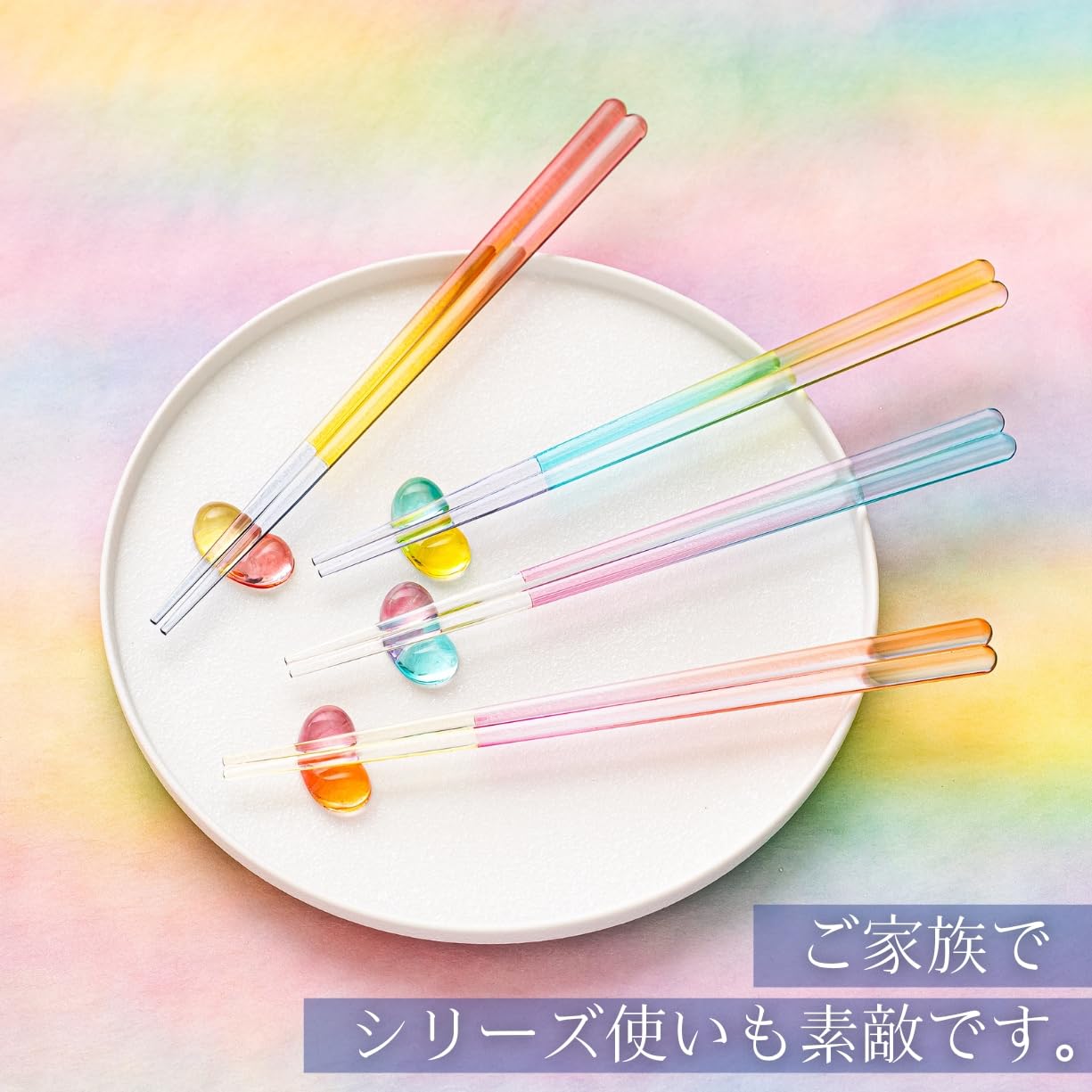 透明感のあるグラデーションが映える箸。持ち手から先端にまで透明度が高く、安っぽくない本格的なお箸に仕上がっています。ガラスのような透明度を保ちつつ、衝撃などにも強いAS樹脂を採用。キレイが長持ち。AS樹脂は、温水や温風にも強く、洗剤にも耐性があります。