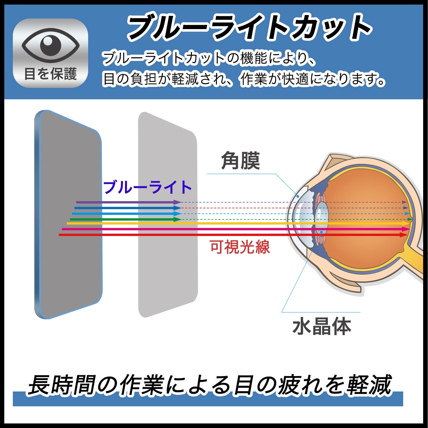 ◆ ブルーライトカット:長時間利用しても目を守れるように、目に有害なブルーライトは48%、紫外線は99%まで、液晶画面保護フィルムによってカットします。