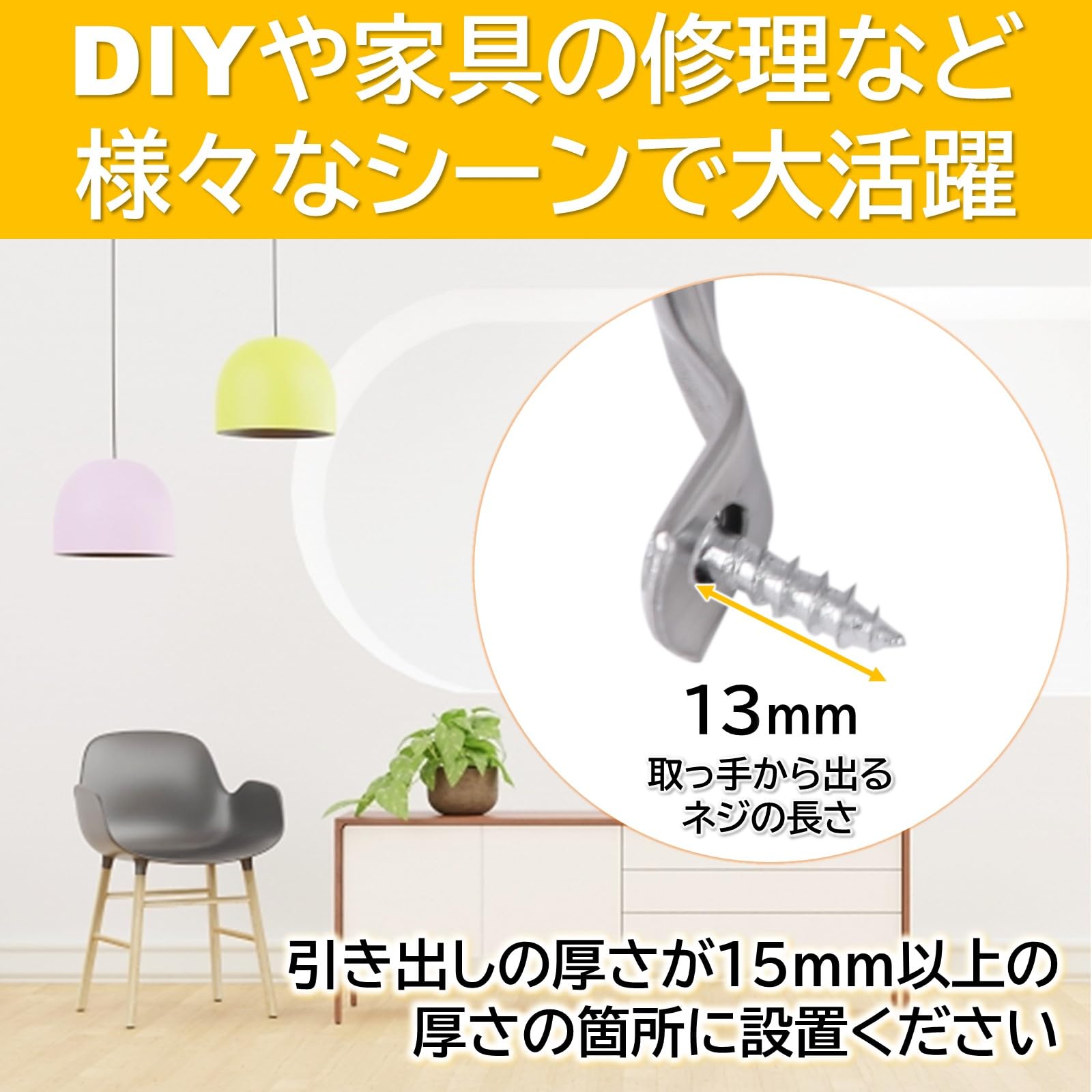 付属のネジを使用する場合、取っ手から出るネジの長さが13mmとなります。引き出しの厚さが15mm以上の厚さの箇所に設置してください。それよりも薄い場合は別途ネジをご用意ください。*交換先のサイズをあらかじめご確認ください。