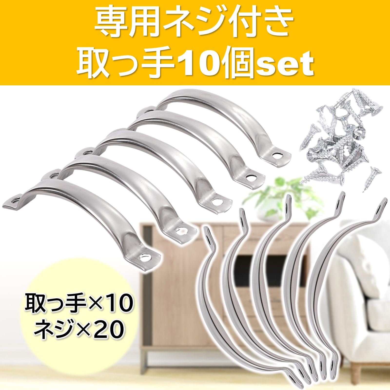 【引き出し 取っ手 ステンレス 食器棚 金具 キッチン ネジ 付き 10個 セット】<br><br>・専用ネジ付きの取っ手10個セット。つや消しシルバーカラーのシンプルで丸みのあるやさしいデザインです。ネジ付きセットのため、届いてすぐに取っ手の交換が可能です。DIYや家具の修理など、様々なシーンでお使いいただけます。<br>・ステンレス鋼の素材感を生かした弓の形の取っ手のため、キッチンやシンク近くの引出し、キャビネットなど、家具の色味や素材を選ばない使い勝手のよいデザインです。<br>・耐久性に優れたステンレス鋼製で、メッキと違い剥げてくる心配がありません。よく手の触れる取っ手に最適な素材の一つです。<br>・付属のネジを使用する場合、取っ手から出るネジの長さが13mmとなります。引き出しの厚さが15mm以上の厚さの箇所に設置してください。それよりも薄い場合は別途ネジをご用意ください。*交換先のサイズをあらかじめご確認ください。<br><br>(仕様)<br>ネジ穴間の距離(約): 78mm/105mm/130mm<br>セット個数:10個<br>付属品: ねじ20本<br>材質: ステンレス鋼<br>重量(約): 16g<br>※モニターの環境により、色の見え方に若干差が生じる場合があります。