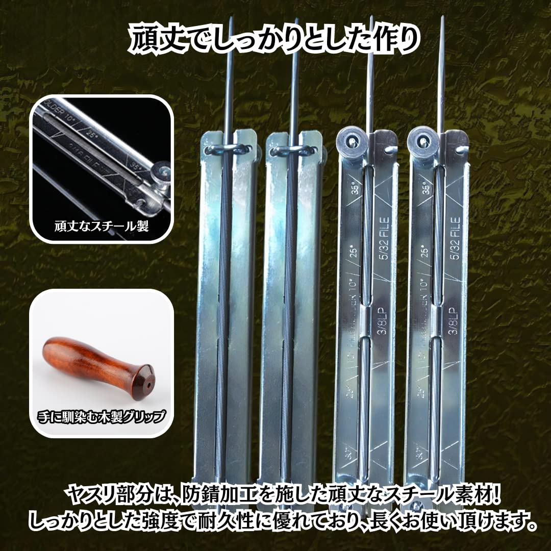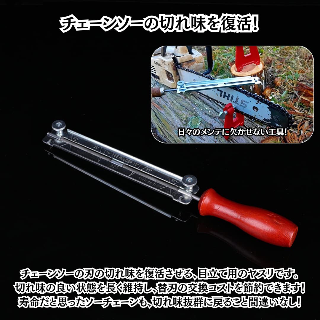 【切れ味を復活させるヤスリ!】切れ味が悪くなったチェーンソーの刃を復活させる、ホルダー付きの目立てヤスリです。切れ味の良い状態を長く維持することができるため、替刃の交換コストを節約できます。寿命だと思ったソーチェーンも、当工具で切れ味抜群に戻ること間違いなし!<br>【初心者でも安心な角度ガイド!】ヤスリのホルダー部分には、チェーンソーの刃を正確に目立てする為の角度ガイドが付いております。初心者の方でも、正しい角度となっていることを確認しながら目立て作業を行って頂けるため安心です。<br>【頑丈でしっかりとした作り】ヤスリ部分は防錆加工を施したスチール製のため、しっかりとした強度と耐久性を持ち合わせた材質となっております。また、持ち手部分は握りやすく手によく馴染む木製で、力を込めやすい作りとなっております。<br>【電池不要で軽量】片手で簡単に持てるほど軽量で、コンパクトなフォルムで持ち運びに最適です。電池や充電なども不要のため、手間なくご利用頂けます。チェーンソー作業のお供として、是非ともご携帯ください!<br>【様々な機種に対応可能】4.0mm/4.5mm/4.8mm/5.0mm/5.5mmの5種類をご用意しております。お使いのチェーンソーの機種に合わせて、お好みのヤスリ径をお選び頂けます。<br>【製品仕様】長さ:各サイズとも約30cm、重量:約150g \u203b本製品は購入から30日間の返品保証付きとなります。日本人スタッフが迅速・丁寧にご対応いたしますので、安心してお買い求めください。