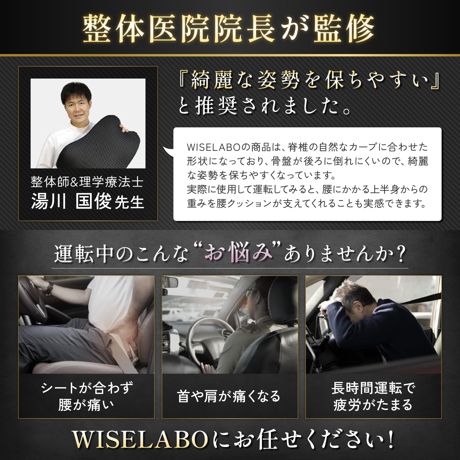 【整体医院院長が監修】整体師キャリア20年以上の整体師・湯川国俊先生による監修。 専門家目線で運転中の骨盤や腰、肩への負担を考慮し、理想的な曲線とクッション性に仕上げました。 また、表面の生地には通気性に優れた4Dメッシュ生地を採用し、オールシーズン快適にご使用いただけます。