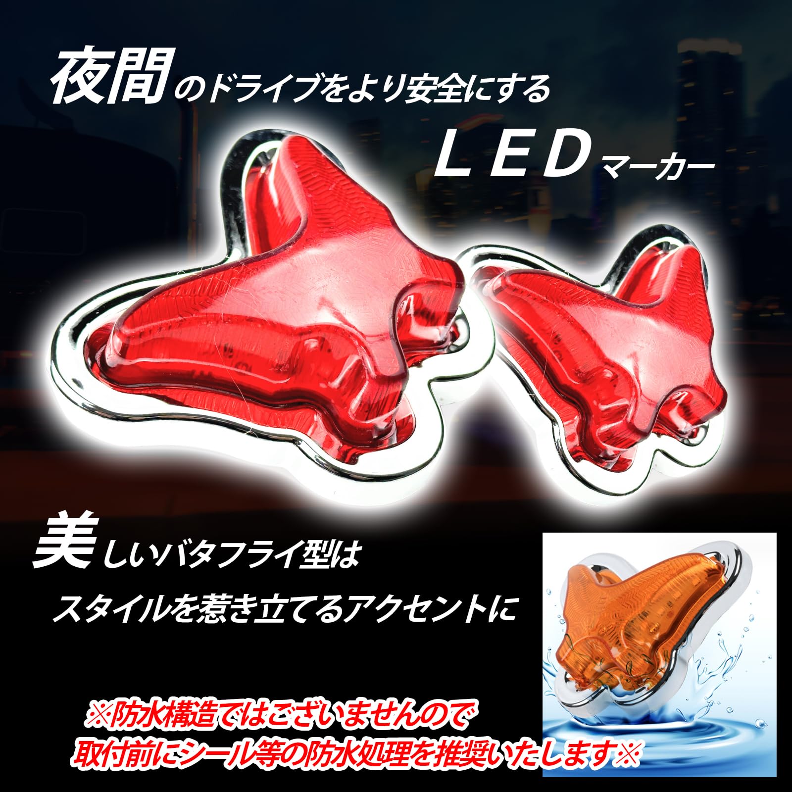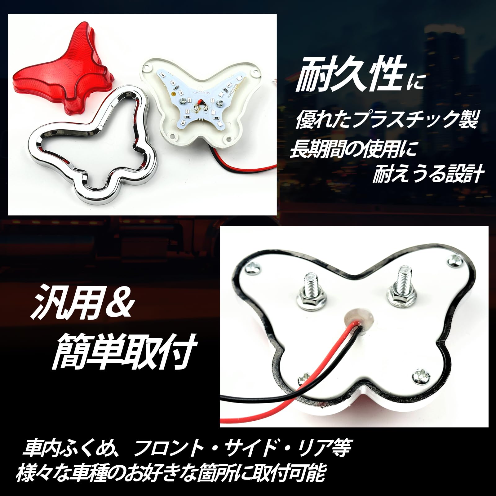 【安全性向上】HTharrosの蝶型、サイドマーカーランプは夜間のドライブをより安全にします。明るいLED光で、あなたのトラックやデコトラが他のドライバーにしっかりと認識されます。事故防止にも繋がるこのライトで、夜道も安心して走行できます。【汎用性】24Vに対応しており、さまざまなトラックやカスタム車に簡単に取り付け可能。プラスチック製で耐久性に優れ、長期間の使用にも耐える設計です。2個セットで、車内も含め、フロント、サイド、リア等の必要な箇所に適切に配置できます。 【スタイリッシュ】レトロなデザインのサイドマーカーで、あなたの愛車を一際目立たせる電飾アクセサリーとなります。車体のカスタムにこだわる方には、このアイテムがスタイルを一層引き立てるアクセントになるでしょう。【カラー】レッド、オレンジ、ブルー、グリーン、ホワイト各2個セットよりお好みによりお選びください。 【多用途性】トラックだけでなく、個人の車にも適用可能なこのライトは、バックライトやデコレーション、イルミネーションとしても使用できます。※防水構造ではございません、取付け前にシール等の防水処理を推奨いたします。【サイズ】最大幅約9cm、高さ約7cm、厚み約2.5cm、取付けネジピッチ約3cmとなります。 【注意事項】取り扱い説明書はありません。適合確認、取付のサポートは行っておりません。画像及び寸法をご参考にご判断ください。※海外生産品の為、製造上のバリ、若干の色ムラ、輸送時の小傷等が発生する場合がございます。またモニター環境により実際の色と違って見える場合がございます事、予めご了承の上ご購入下さいませ。