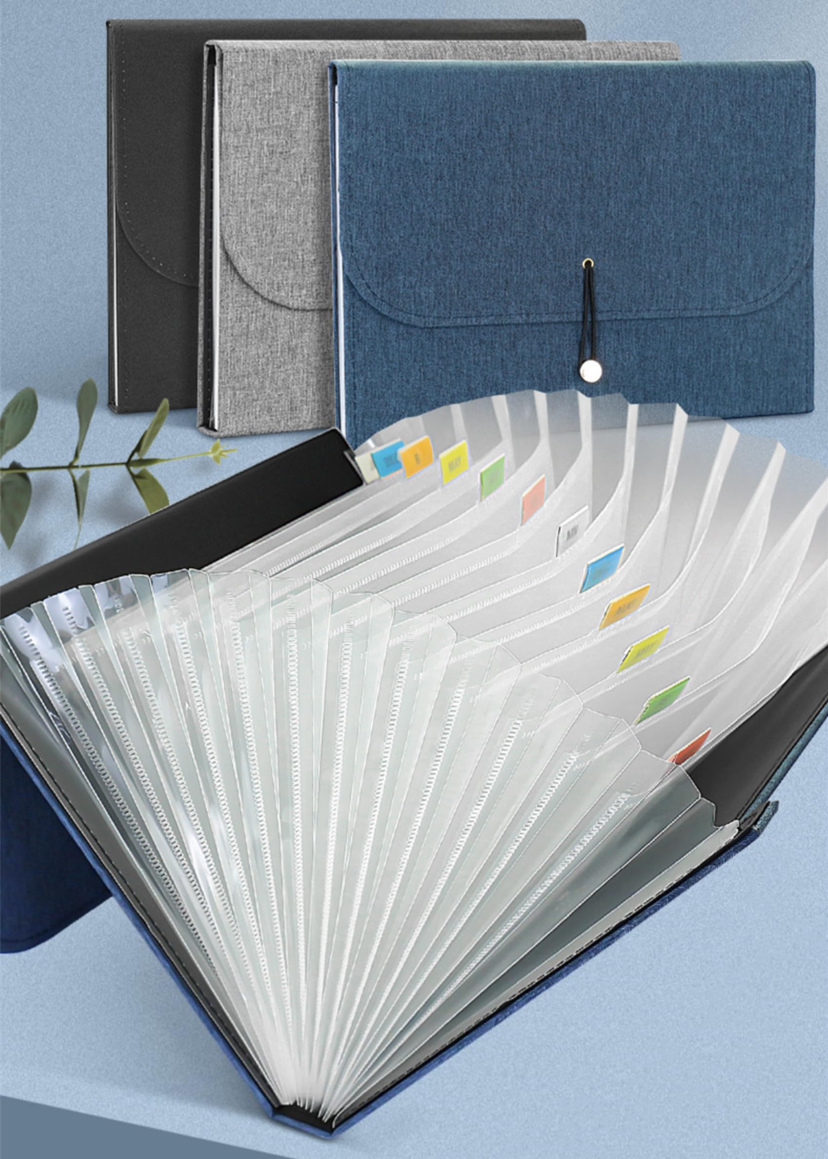 製品詳細<br> 素材:布製PPプラスチック<br> シートサイズ:レター、A4<br> このフォルダーは、商業的な機会、オフィス文書の保管、家庭用文書の保管、就職の面接、学校などに適しています。<br> 旅行や会議など普段使いにも適した薄型フォルダーです。<br> この美しくユニークなファイルフォルダーは実用的なので、友人、教師、同僚、顧客、パートナーへの素晴らしい贈り物です。<br> 書類をよく使う人に最適なA4 ドキュメントファイル 束になったクリアファイルでは書類が見つけにくい・・・、プリントが曲がってる・・・、留めていたクリップが他の資料に引っかかって取れた・・・etc。GEMZISのドキュメントファイル 書類収納ケースを使うことでこのような煩わしさから解放されます。書類をきっちり分類し、クリアファイルもそのまま収納可能。書類をまとめて持ち運びでき、お目当ての書類をすぐに取り出すことができます。あの資料を持ったっけ?がなくなる安心感をぜひ味わってください。<br> 今までになかった高級感のあるハードカバー製 今までの書類ケースのイメージを覆すそのシンプルでクールなデザインはさまざまなシーンで好印象を与えることができます。一般的な全面ポリプロピレン(PP)製のドキュメントファイルと比較し高い耐久性を誇るハードカバーは防水性能も備えています。ワンタッチで開閉できるストラップにより、書類が多くてボタンを留められないということもありません。スマートに書類の出し入れが可能です。<br> 使うシーンを選ばないユニセックスデザイン 持ち運びに特化したスリムタイプのデザインなのにしっかり書類を収納できます。サイズは約33cm x 24.5cm x 3cm。収納力を確保しながらも厚みを抑え引っかかりなくカバンへも出し入れできます。洗練されたユニセックスデザインの外観により、営業や学校のプリントの収納などシーンを選ばずお使いいただけます。毎日使う書類ケースだからこそいい物を使いたい方にぴったりの製品です。<br> すぐに見つかる!書類をスマートに出し入れ可能な仕切り スリムタイプなのにしっかりと開くことのできるアコーディオンタイプのじゃばら仕切りにより、目的の書類を素早く見つけることができます。13ポケットあるので12月別+アルファで整理したり、会議や授業別に合わせて書類を分類できます。 また本製品にはカラフルなインデックススリットを付属しています。付け替え可能なので分類用途が変わっても目的に応じてインデックスを整理できます。裏面は平らな構造になっているので、膝の上でバインダーがわりに書類に書き込むことも可能。プレゼン資料やテキストなど持ち物が多い学生にもぴったりです。<br> 細部のこだわりのロールアップ構造。A4クリアファイルも入るサイズと高い耐久性 仕切りはしっかりした厚みがあるのでペラペラして書類を入れにくいということもありません。また、ファイルポケット上部のエッジ部分はロールアップ構造により耐久性を高め手を切ったりケガの心配もありません。A4サイズのプリントやA4クリアファイルを折りたたまずにきれいに収納できます。