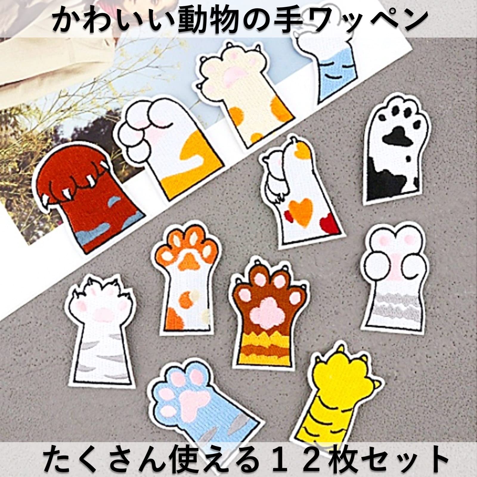【かわいい動物の手のワッペン】おしゃれでかわいい動物の手のワッペン!いろいろなポーズの動物のおてて12枚入りワッペンセットです。刺繍ならではの立体感と光沢があり高級なイメージのアップリケです。