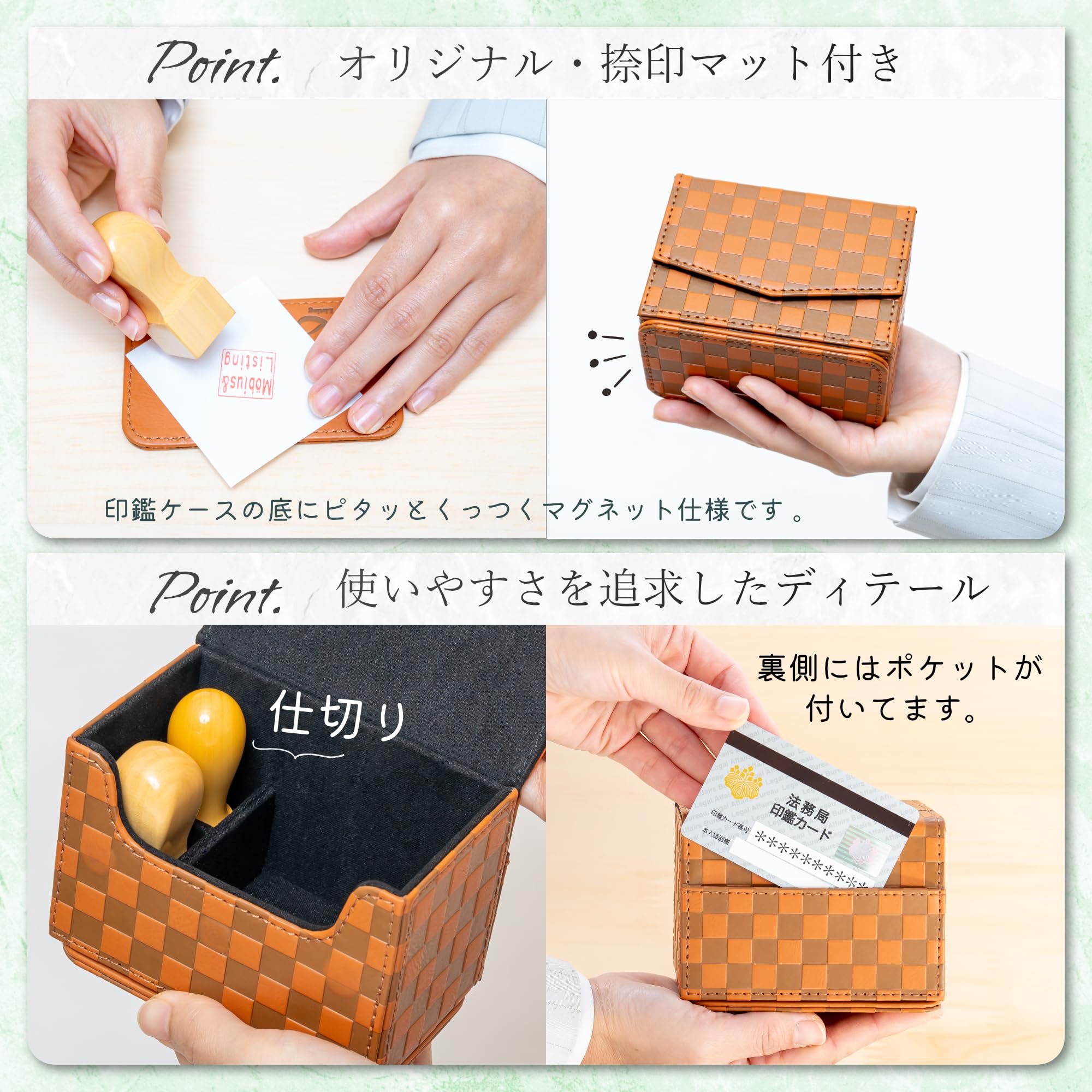 1.法人・会社・お店・店舗・個人事業主・自営業者・フリーランスなどの印鑑(実印・代表者印・銀行印・角印・役職印・認印)、ゴム印(住所印・組み合わせ印・親子印)、ビジネス用スタンプ、朱肉を収納するための、ハンコケース(印箱・印鑑収納ボックス) 2.商談、取引、契約などのビジネスシーンで活躍するスタイリッシュなデザイン 3.商売繁盛など、縁起の良い市松模様