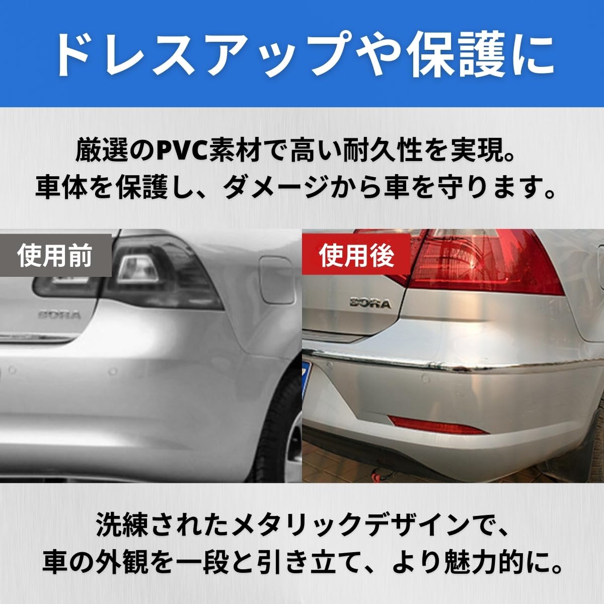 愛車のドレスアップ/ボディーの保護/キズ隠しに!メタリックシルバーのメッキモール!選べる3サイズ!長期間にわたって車体を保護し外部からのダメージから車を保護。スタイリッシュなカラーで愛車をグレードアップもしてくれます。愛車の雰囲気に合わせて手軽にコスパ良く保護やドレスアップしたい方へオススメです。 【テープ不要の簡単取付&長さカットも】特別な工具や専門技術は一切不要!両面テープ付きなのでテープを剥がしてペタッと貼るだけでOK!必要な長さに合わせてハサミやカッターでカットして自由にお使いいただける汎用タイプのマルチモールです。 【高い耐久性】厳選したPVC素材を使用し高い耐久性を実現。もちろん防水仕様。長期に渡って車体を保護し、泥や砂・小石などの各種ダメージから車を守ります。 【人気のメタリックデザイン】一番人気のメタリックなシルバーカラーを採用。車の外観を一段と引き立て、洗練された高級感のある&かっこよくてスタイリッシュなイメージにあなたの愛車をドレスアップしてくれます。 【サイズ】多くの車種や用途にご利用いただけるよう全3種類をご用意。幅約50mm×約3m、幅約30mm×約5m、幅約12mm×約5mよりお好きなサイズをお選びください。※購入前に必ずご利用車種や本製品サイズ等をご確認の上、ご自身の車種に装着可能かどうかをご確認ください。説明書の添付や取付サポートはございませんので予めご了承くださいませ。