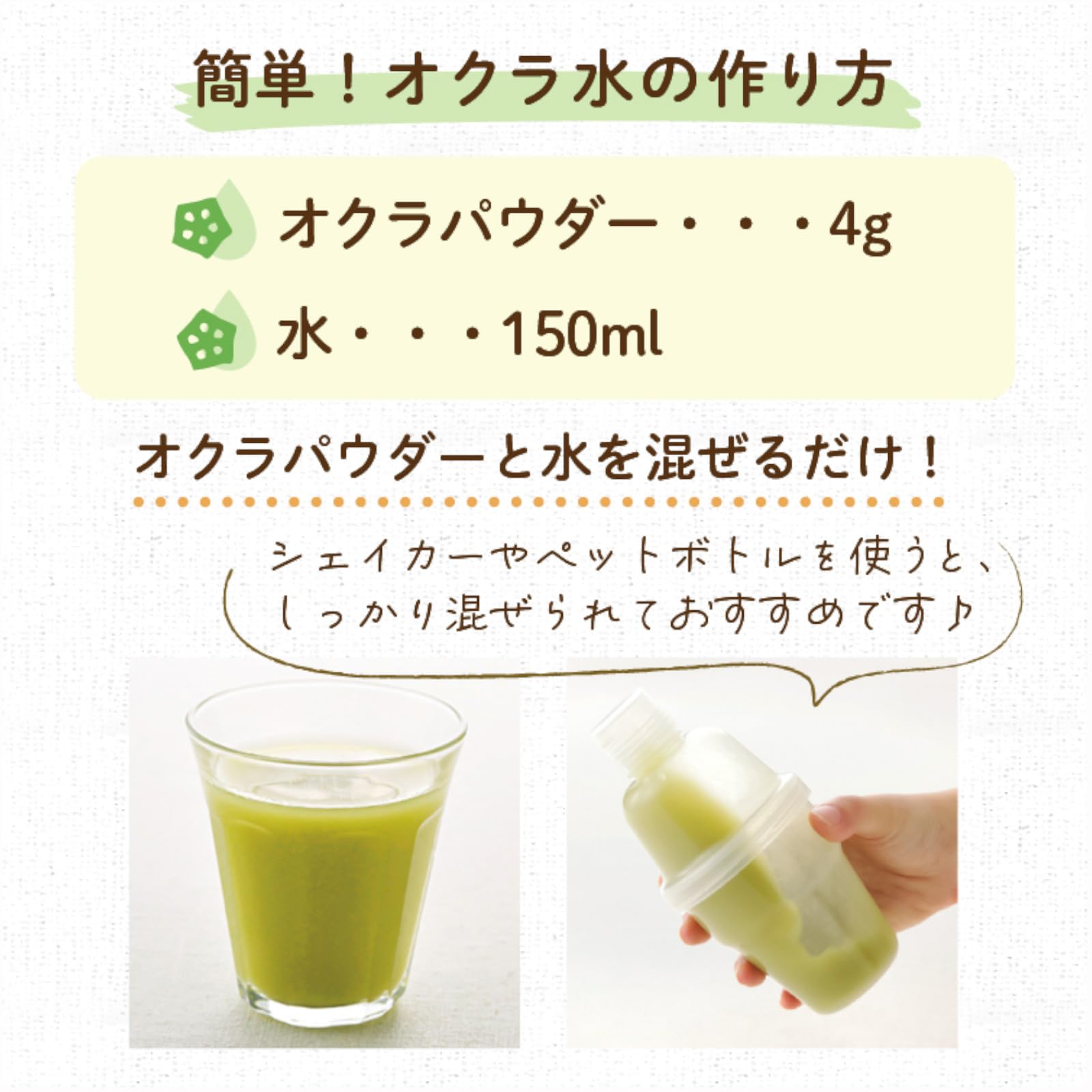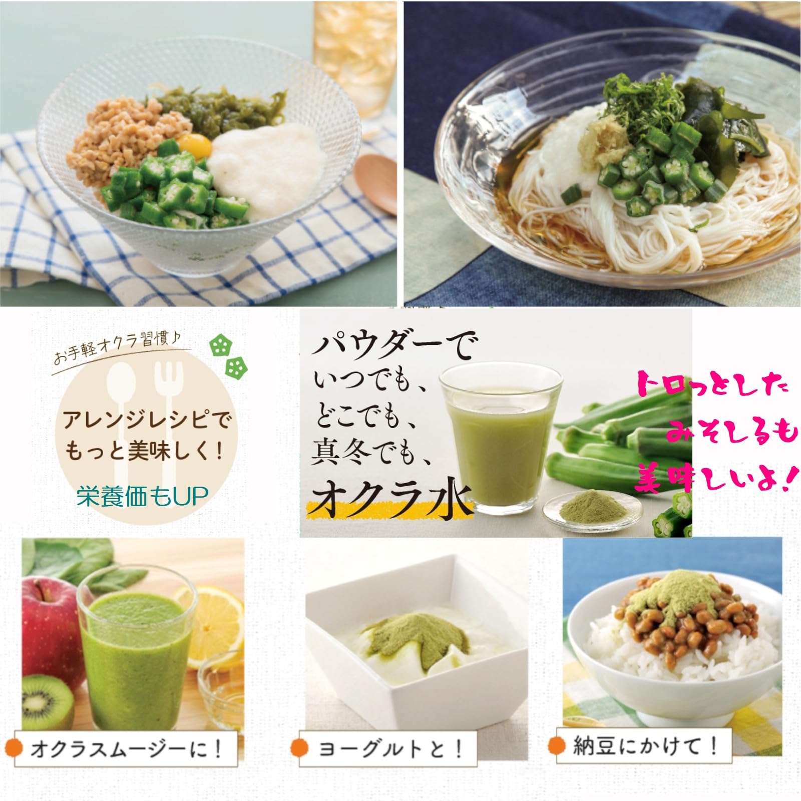 ✅オクラには粘性があり、パウダーにすることで料理に様々な用途で利用できます。例えば、スープやシチューに加えたり、スムージーやジュースに混ぜたりすることができます。