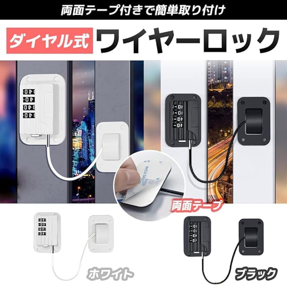 ペット、赤ちゃん対策、セキュリティー対策に。開閉窓、スライド窓、冷蔵庫や家具などに取り付ける開閉窓ロックです。両面テープで簡単取り付け。4桁のダイヤル式ワイヤーロックです。