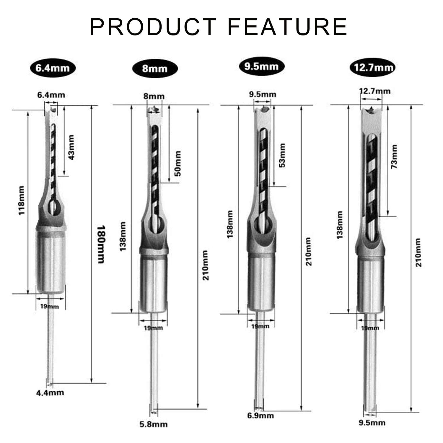 【ニーズを満たします】簡単で正確な穴あけ、四角穴マシンの適切なパワーに合わせて異なるサイズの角穴ドリルを使用。ニーズを満たす4つの異なるサイズを選択できます。1/2インチ (12.7mm)、3/8インチ (9.5mm)、5/16インチ (8mm)、1/4インチ (6.4mm)。