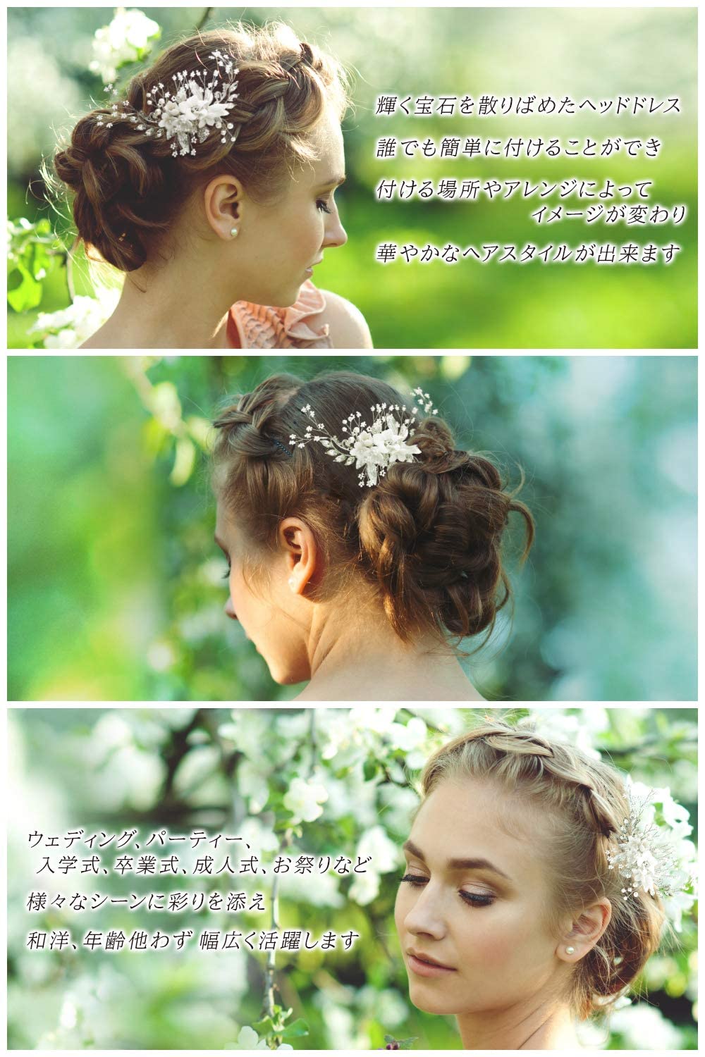 【気品のあるこだわりビジューヘッドドレス】ハンドメイドで丁寧に編みこんだ光沢のビジュー、イミテーションパールが輝くフラワーモチーフの美しさを最大限に生かしたデザインのヘアアクセサリーです。高級感ある上品な輝きは、女性の和服スタイルやドレススタイルを際立たせます。普段使いにも可能なシンプルなアイテムだからこそ、使い心地や機能性、デザインの美しさにこだわっています。誰でも手軽に、美しいヘアアレンジをお楽しみいただけます。綺麗な見た目のデザインで、手作業で磨き上げたパールを細いワイヤーにたくさん付いて、ワイヤーを曲げて簡単に好みの角度に変えることができ、キラキラと光沢が輝いて優雅で上品感を演出し、存在感が抜群な髪飾りです。