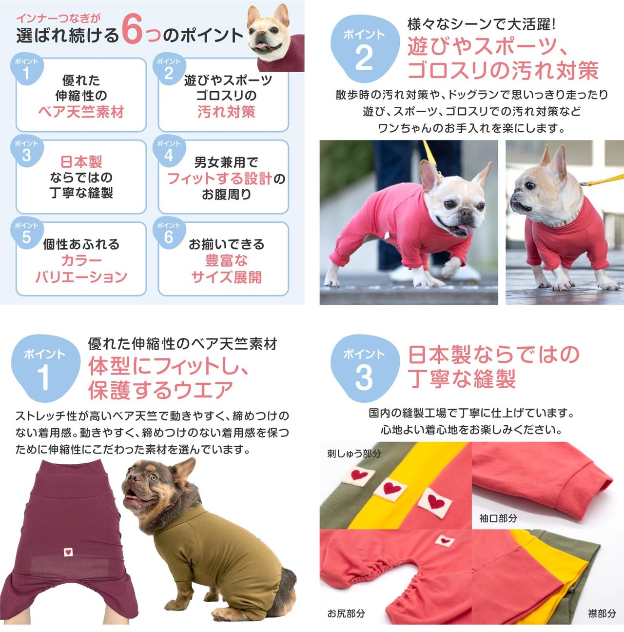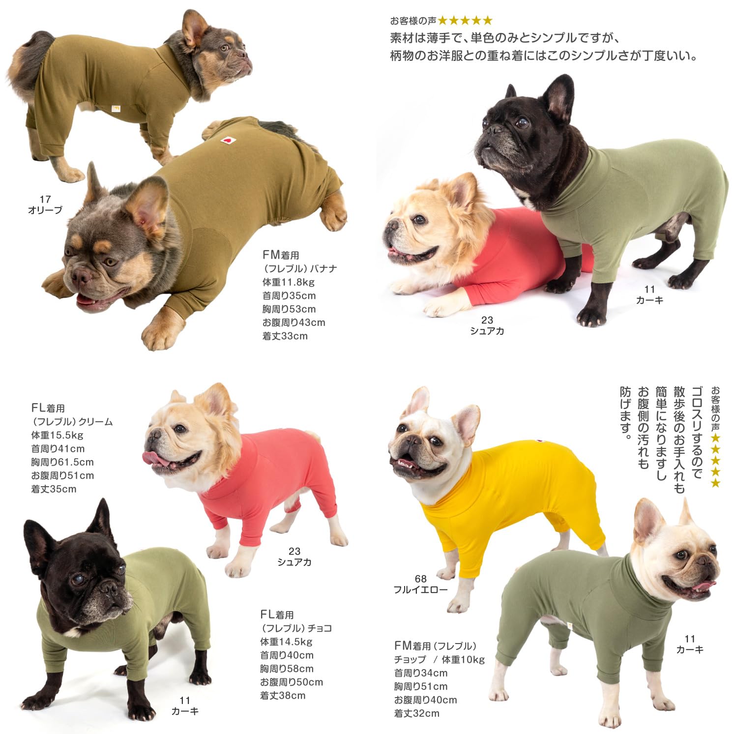 愛され続けて10年以上。 ヘビーローテーションの長袖インナーつなぎ。 当店での再購入や複数購入など、シリーズ累計のリピート率が高い商品。 ぽっちゃり体型でもしっかりフィット。 驚くほど伸縮性が高く、体にやさしく寄り添います。締めつけ感がなく快適な着心地で、動きやすさも十分に保っています。 着せてみれば実感!驚くほど伸縮性があり、体にフィットして保護するウエア。 素材の伸びの良さを活かし、インナーとしても大活躍。 ※普段大きめサイズを着用するお子様には、ジャストサイズまたは1サイズ下をおすすめします。 ●本体:40ベア天竺(綿94%・ポリウレタン6%) ●日本製:MADE IN JAPAN ●伸縮性(5段階):5 ●厚さ(5段階):2 ●お洗濯について:手洗い又は、洗濯ネットを使用。アイロンは、当て布をして中温。 ファスナー・ボタン・面テープがある商品は、しっかり止めた状態で洗濯をしてください 国内の縫製工場と連携して、一つひとつ丁寧に仕上げています。心地よい着心地をお楽しみください。 対象犬種 フレンチブルドック、パグなど
