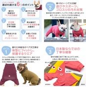 国内の縫製工場と連携して、一つひとつ丁寧に仕上げています。心地よい着心地をお楽しみください。 対象犬種 フレンチブルドック、パグなど