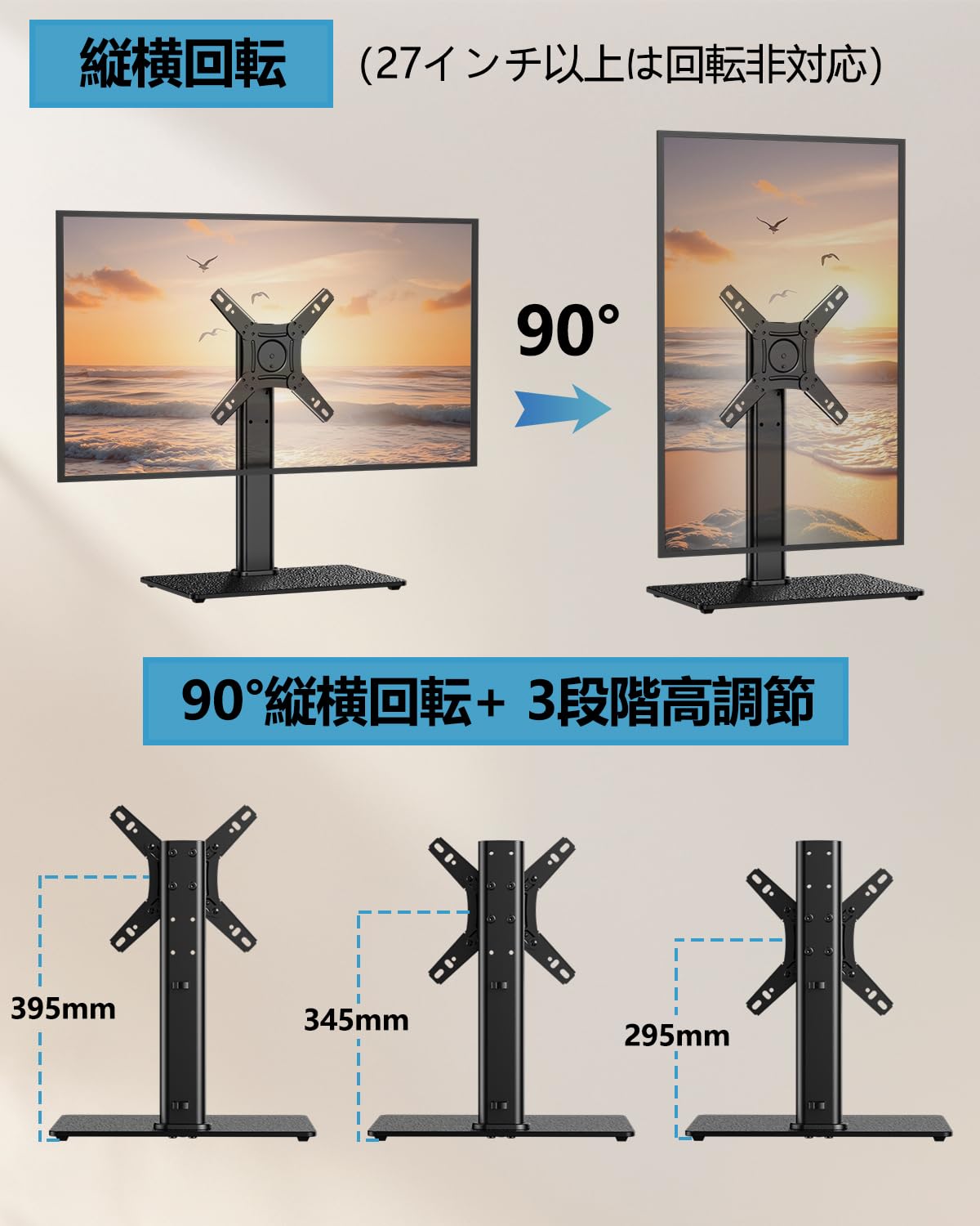 【縦横画面切り替え機能付き】このTVスタンドはディスプレイスタンドとしてもご利用いただけます。±90°の縦横切り替え機能を搭載しており、ゲームや業務用の縦画面シーンなど、様々な視聴ニーズに合わせて画面表示を最適化できます。