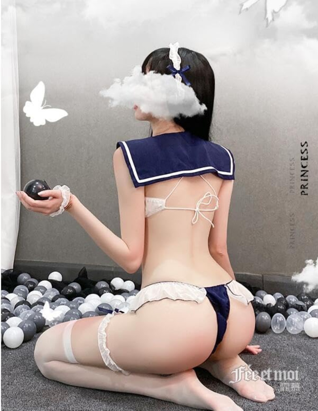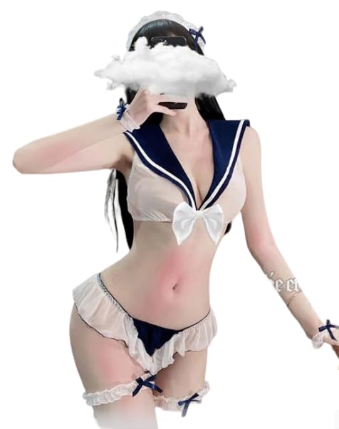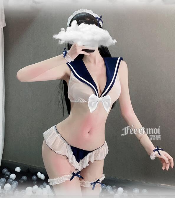 [XUTNZA] セーラー服 コスプレ セクシー ランジェリー メイド コスプレ 衣装 女学生 仮装 学生服 コスチューム 家政婦 制服 コスプレ衣装 5点セット シースルー 青 (フリーサイズ、60kg以内適当)
