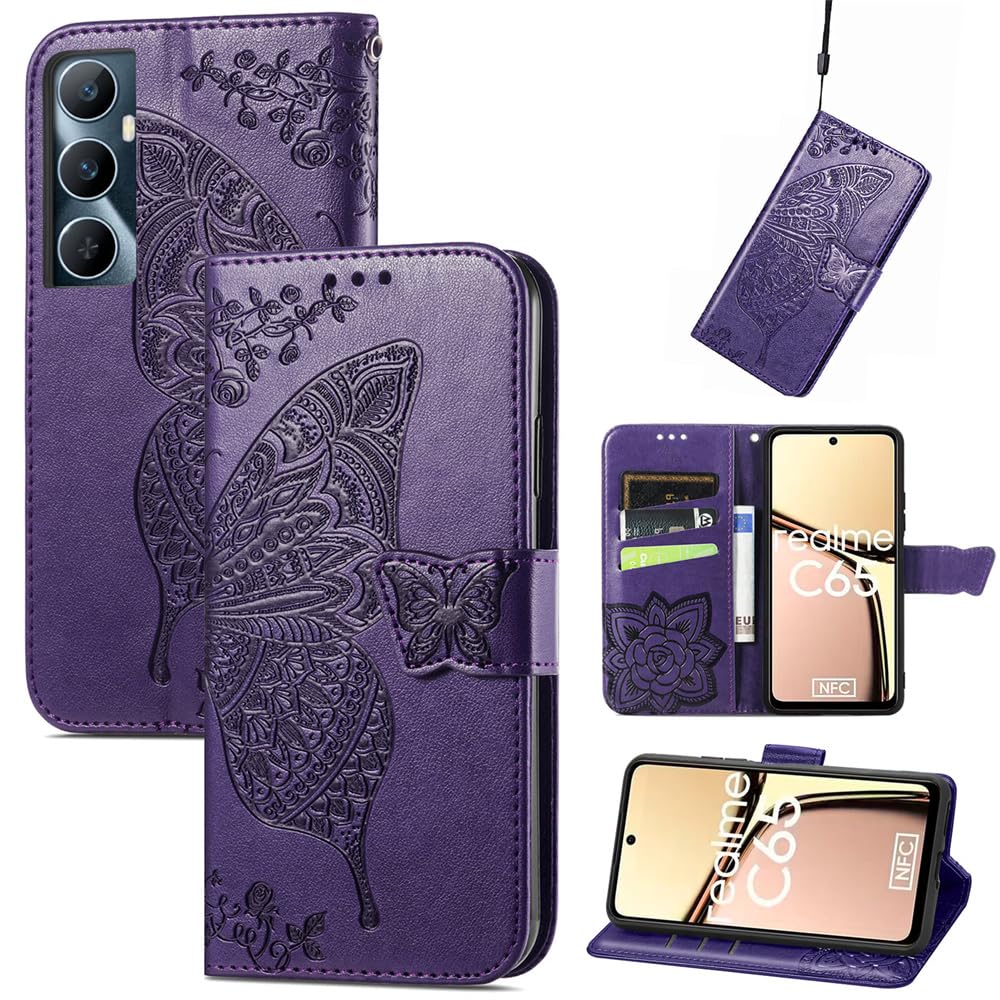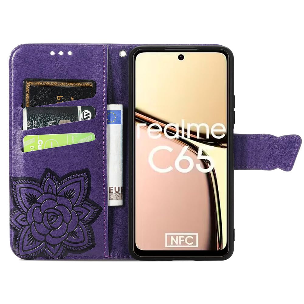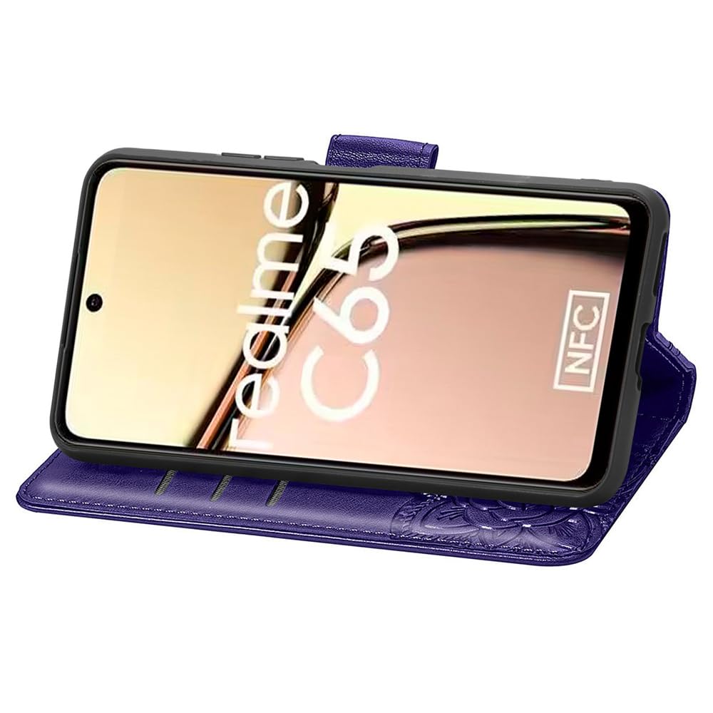 多機能カードスロットエンボス携帯電話カバー Realme 12 C65 RealmeC65 4G 携帯電話シェル磁気フリップカバースタンドホルダー ファッションレザーケース(ダークパープル、Realme C65 4G)
