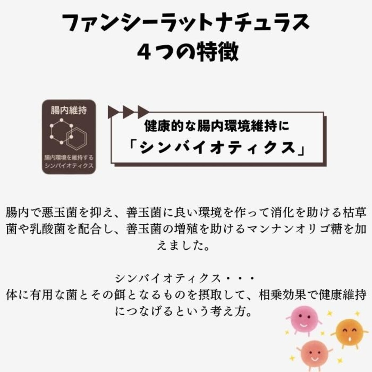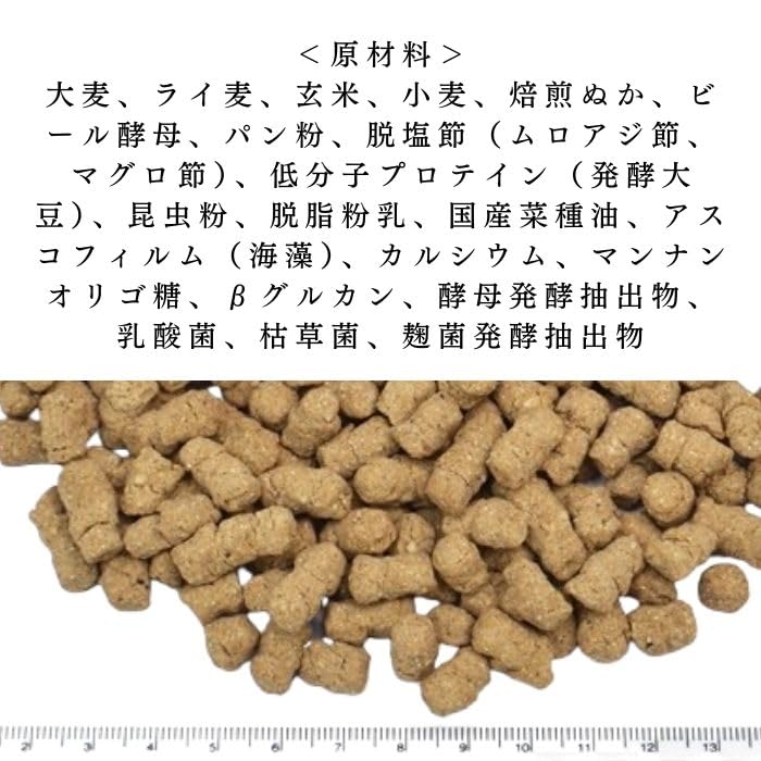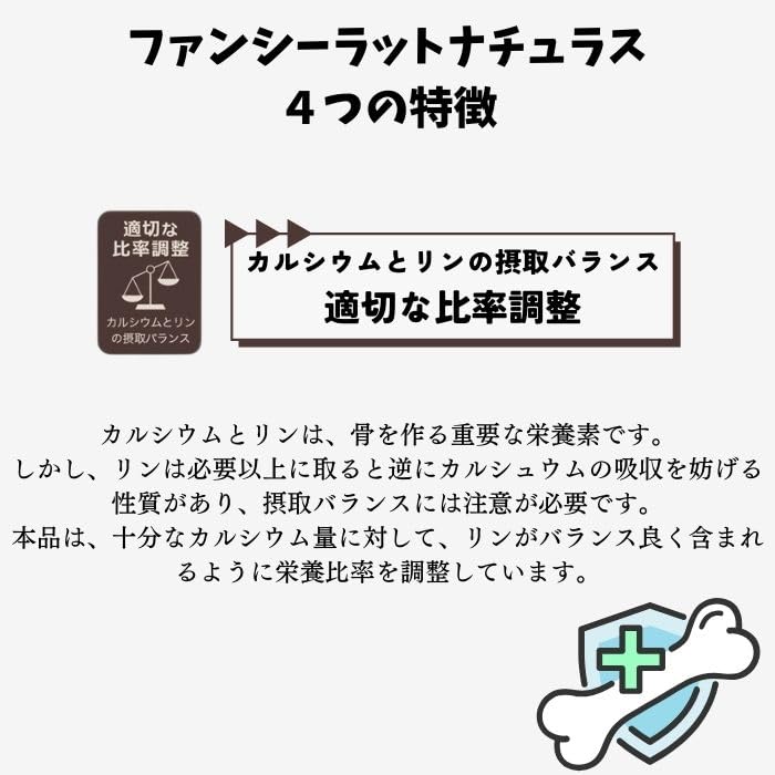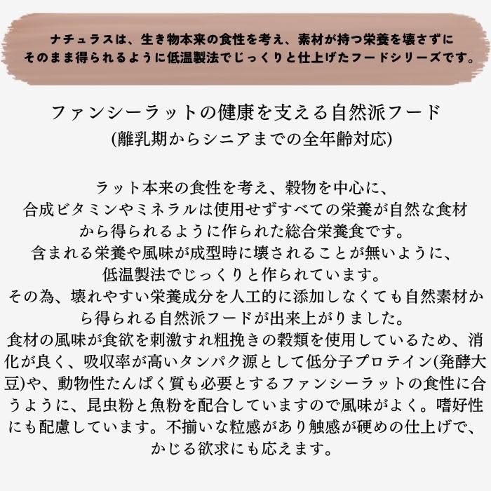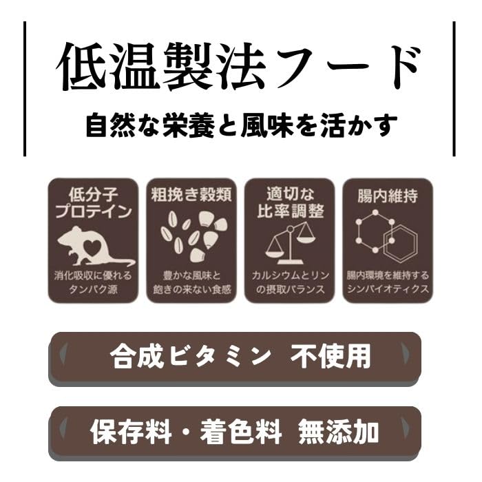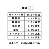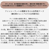 "自然な栄養と風味を生かす低温製法フード ・ファンシーラット本来の食性を考え、素材が持つ栄養をそのまま得られるようこだわり、低温製法で仕上げたフードです。 ・食欲を刺激する粗挽きの穀類を使用、また、消化が良く、吸収率が高いタンパク源に低分子プロテイン(発酵大豆)と、動物性タンパク質(昆虫粉と魚粉)を配合。風味が良く、嗜好性にも配慮しています。さらに健康的な腸内環境維持に枯草菌 ・乳酸菌を配合しマンナンオリゴ糖もプラスしました。 原材料(成分):大麦、ライ麦、玄米、小麦、焙煎ぬか、ビール酵母、パン粉、脱塩節(ムロアジ節、マグロ節)、低分子プロテイン(発酵大豆)、昆虫粉、脱脂粉乳、酵母発酵抽出物、アスコフィルム(海藻)、カルシウム、マンナンオリゴ糖、βグルカン、酵母発酵抽出物、乳酸菌、枯草菌、麹菌発酵抽出物 保証成分:粗タンパク質18.0%以上、粗脂肪4.0%以上、粗繊維3.0%以下、粗灰分4.0%以下、水分10.0%以下、カルシウム1.0%以上、リン0.7%以上 エネルギー:380kal以上/ 100g"