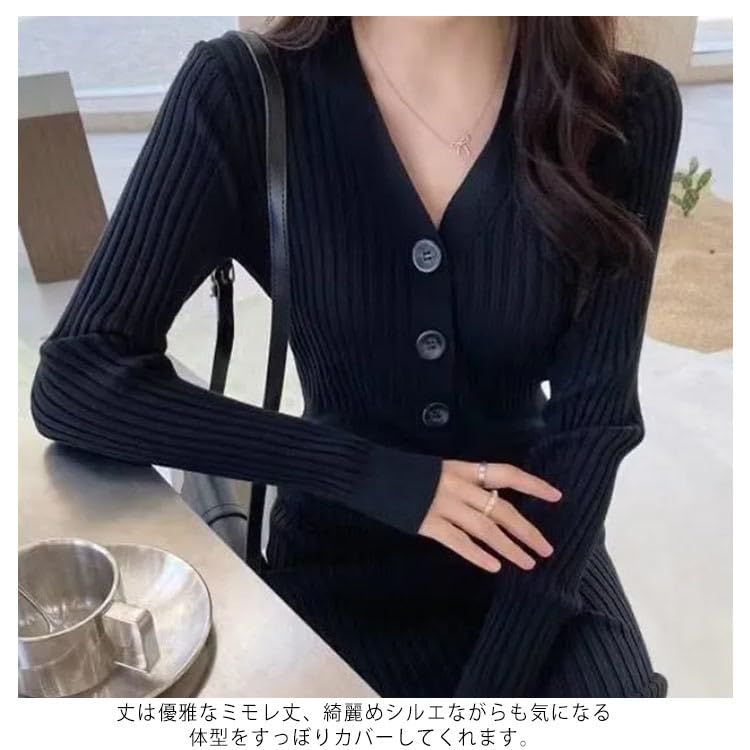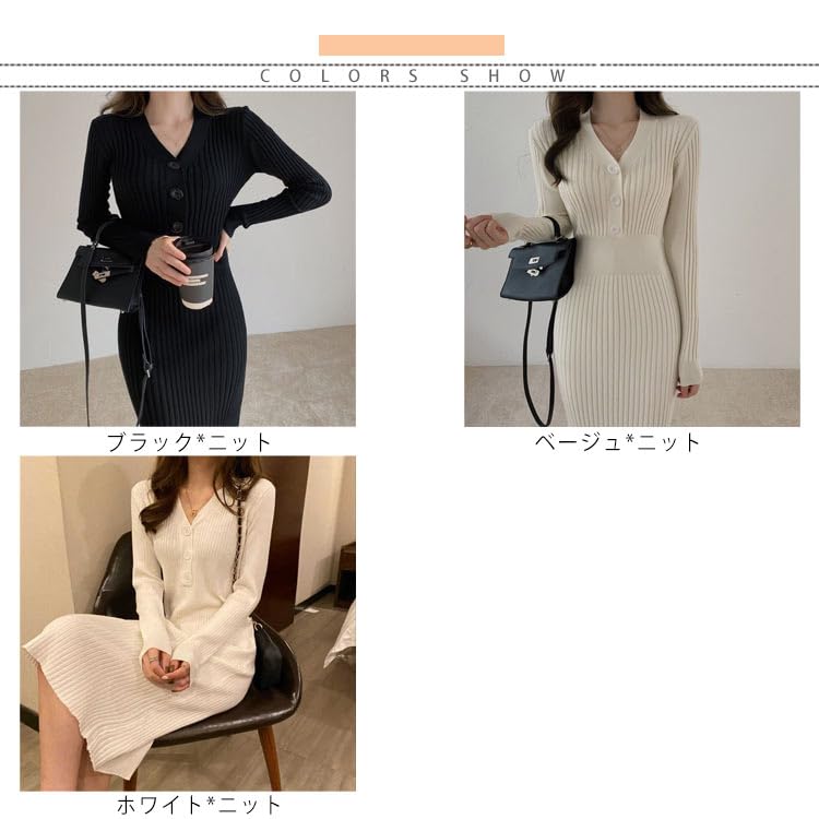 タイト ニットワンピース レディース 秋冬 Vネック 長袖 膝下丈 セーター ロングワンピース リブニット ボディコン ドレス フェミニン エレガント 着やせ 伸縮性 きれいめ 春 秋 冬 S M L XL
