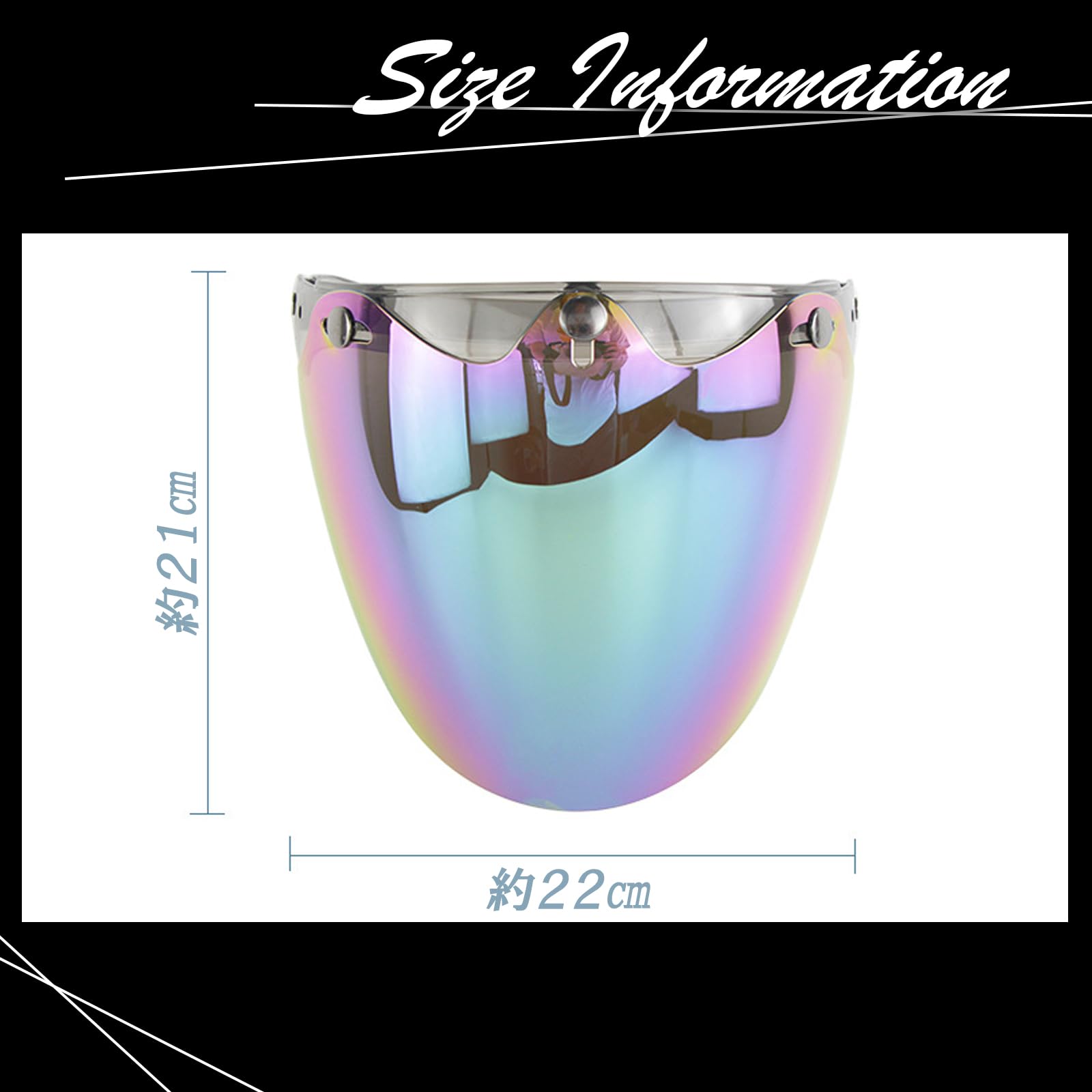 【UVカット・防風・防塵】 ゴーグル サングラスなどに使われる高品質HD偏光レンズによるUVカット機能、日差しやライトによる目の疲れや肌の日焼けを軽減します。防風・防塵機能で、風や虫、砂埃から目や顔を保護するフェイスガード。快適なツーリングを実現します。※クリアーは、色付きの製品に比べて、日光やライトなど眩しさを感じる場合があります。【高強度・高透明度】 高強度なPC素材を使用しているので、飛び石などから保護します。高透明度で、視界を妨げにくい。汚れが落ちやすくお手入れ簡単。【汎用性抜群】 汎用性の高い設計で、ジェットヘルメットをはじめ様々な種類のヘルメットにシールドとして装着できます。様々なバイク、オートバイのヘルメット シールドにお使いいただけるデザイン。必ず商品サイズをご確認ください。【取り付け部ベルクロ保護】ヘルメットの取り付ける部分には、傷防止のベルクロが取り付けられています。装着の際硬い場合がありますが、風などで簡単に外れない為の製品仕様です。取り外しの際は、ヘルメットを傷めないようご注意ください。※開閉可能ですが、硬めの作りになっております。硬い場合は、開閉の接合部にシリコンスプレーなどの潤滑剤をご使用ください。【サイズ、カラー】 縦21cm、横22cm シルバー、レインボー、クリアー