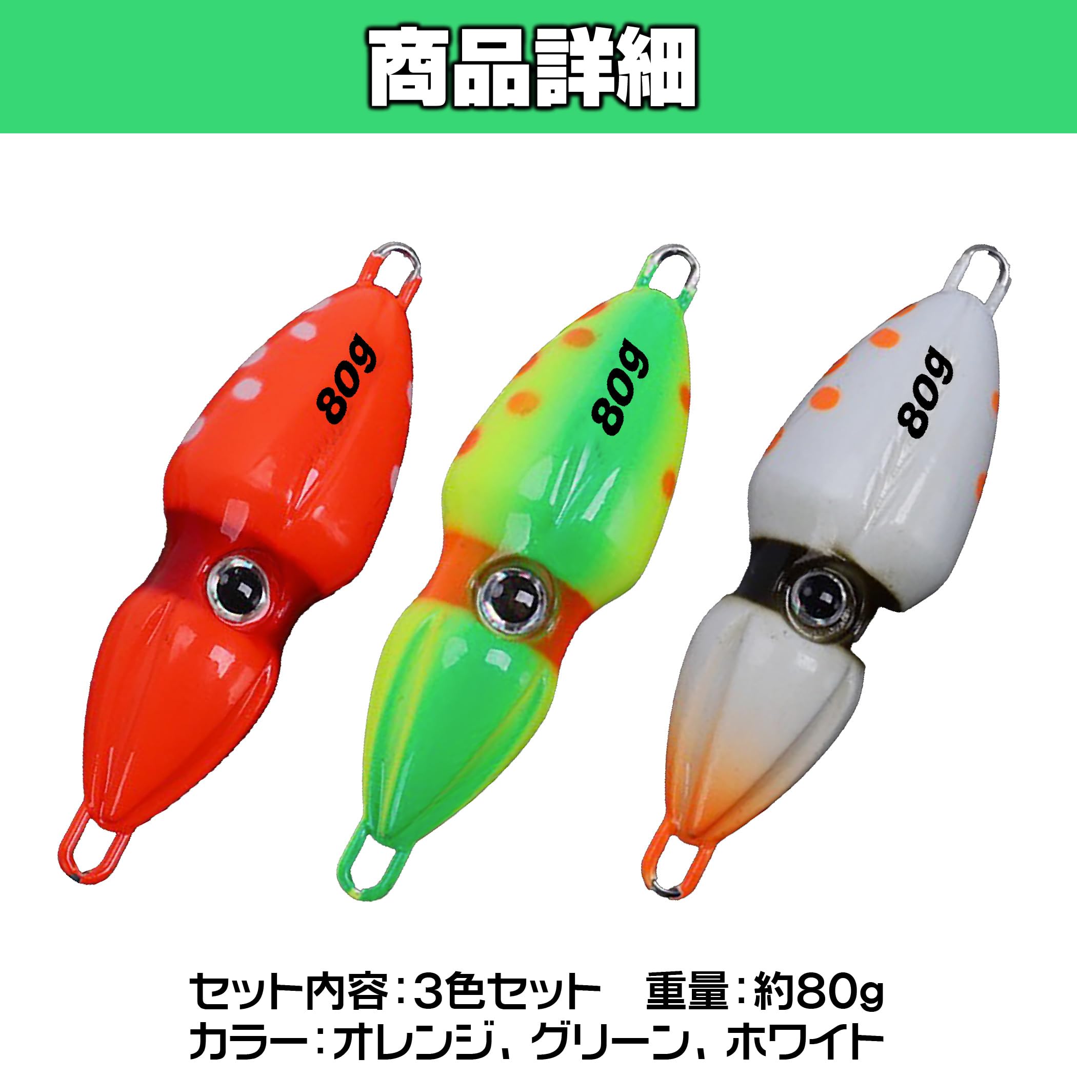 イカ型オモックの夜光カラー3色セット:トレンドに敏感なアングラーから人気を集めているイカ型オモックの夜光カラー3色セットです。オモリとフックだけのシンプルな仕掛けをオモックと呼び、ユーチューバーなどの間でも話題のアイテムです。