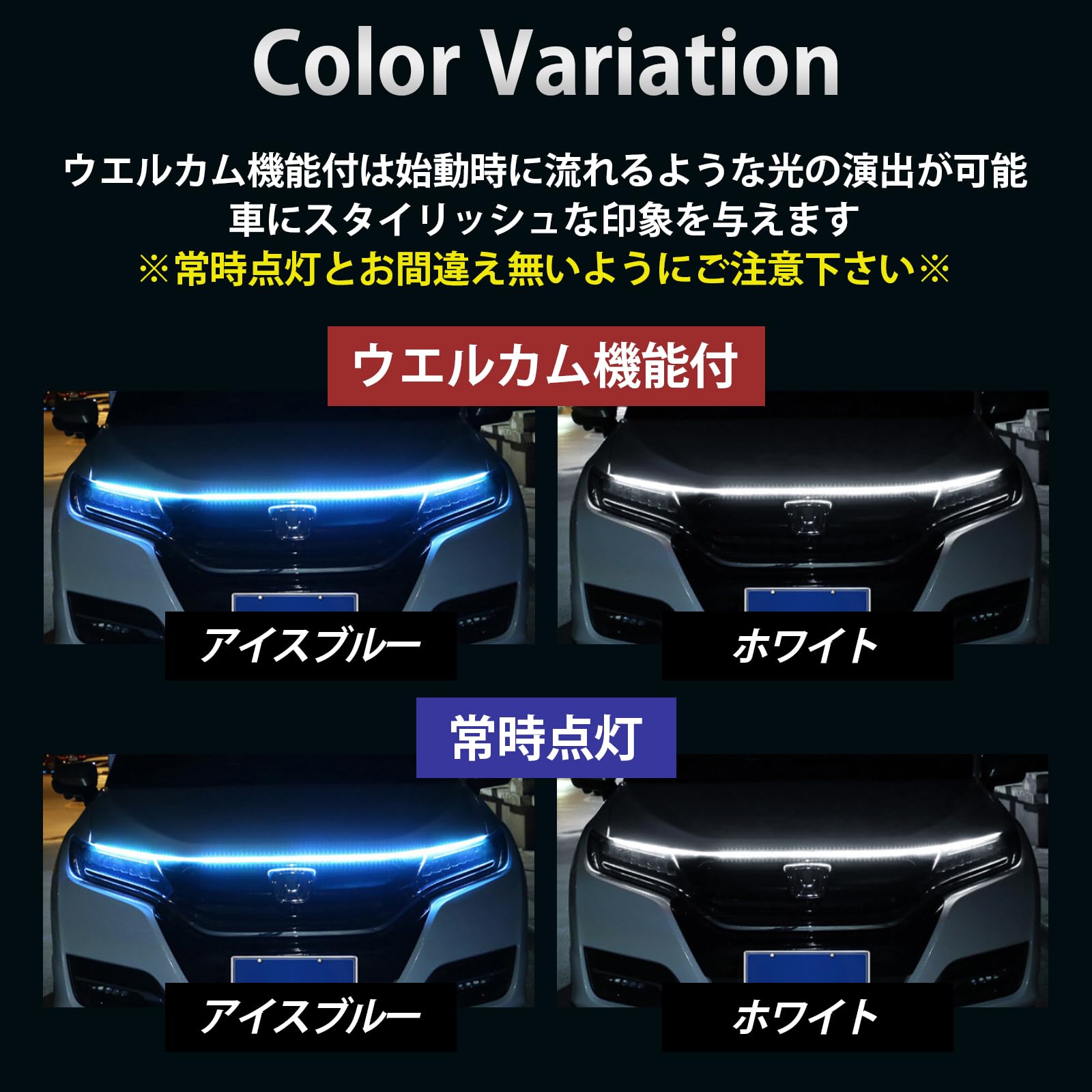 【流れる光の演出】※常時点灯とお間違え無いようにご注意下さい。ウエルカム機能付き、始動時に流れるような光の演出が可能で、車にスタイリッシュな印象を与えます。これにより、車の個性を引き立て、他の車との差別化を図ることができます。夜間のドライブが一層楽しくなることでしょう。