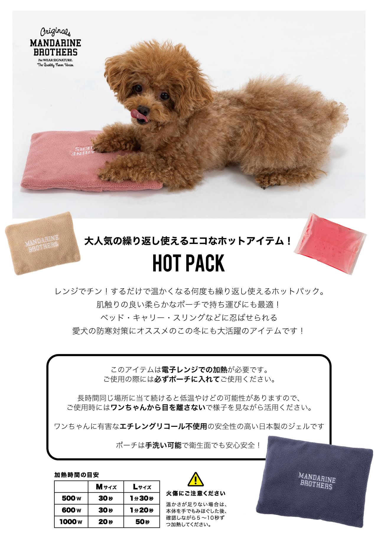 レンジでチン!するだけで温かくなる何度も繰り返し使えるホットパック。肌触りの良い柔らかなポーチで、ベッド・キャリー・スリングなどに忍ばせて愛犬の防寒対策にオススメです。
