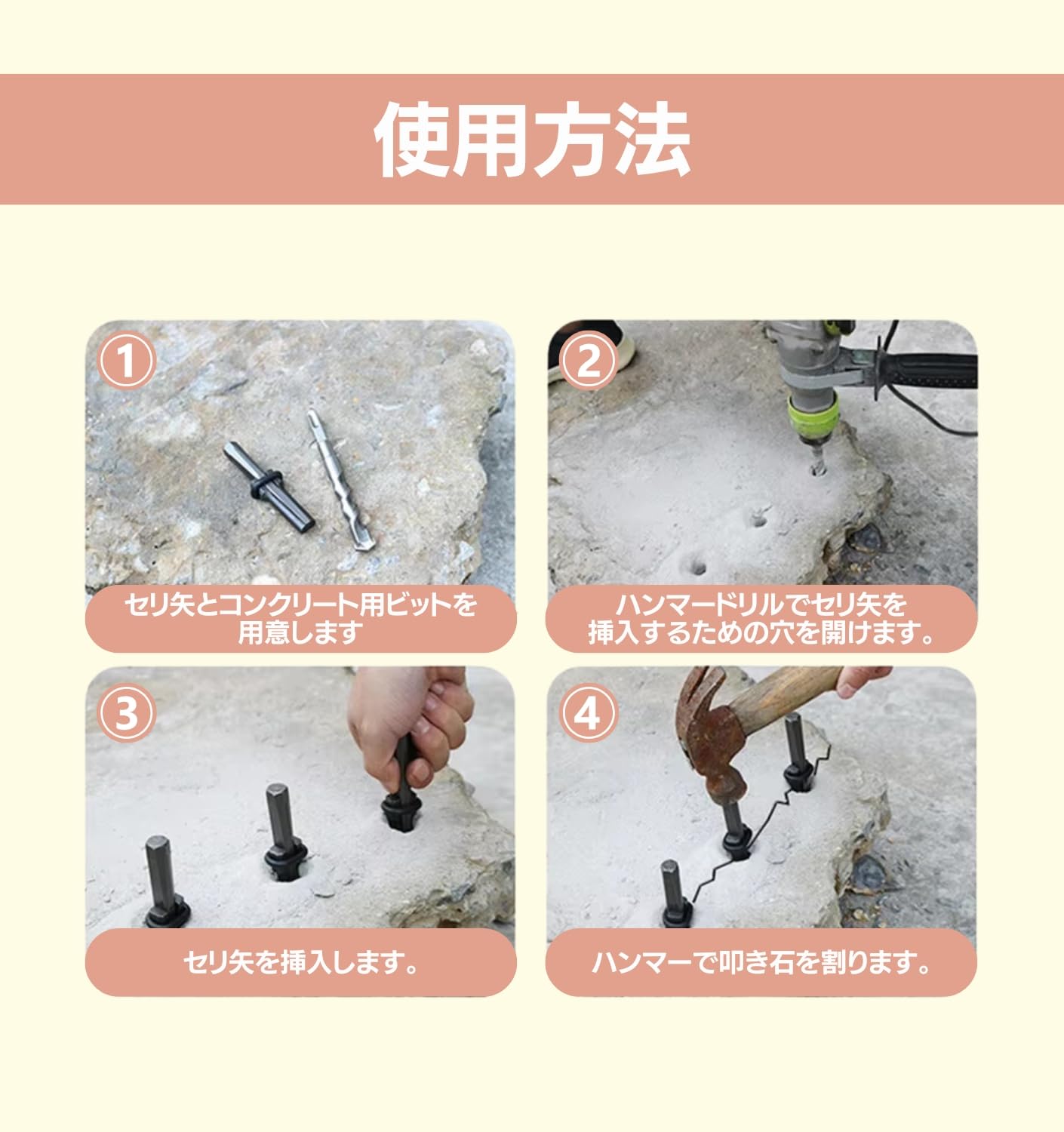 【使用方法】①セリ矢とコンクリート用ビットを用意します。②ハンマードリルでセリ矢を挿入するための穴を開けます。③セリ矢を挿入します。④ハンマーで叩き石を割ります。
