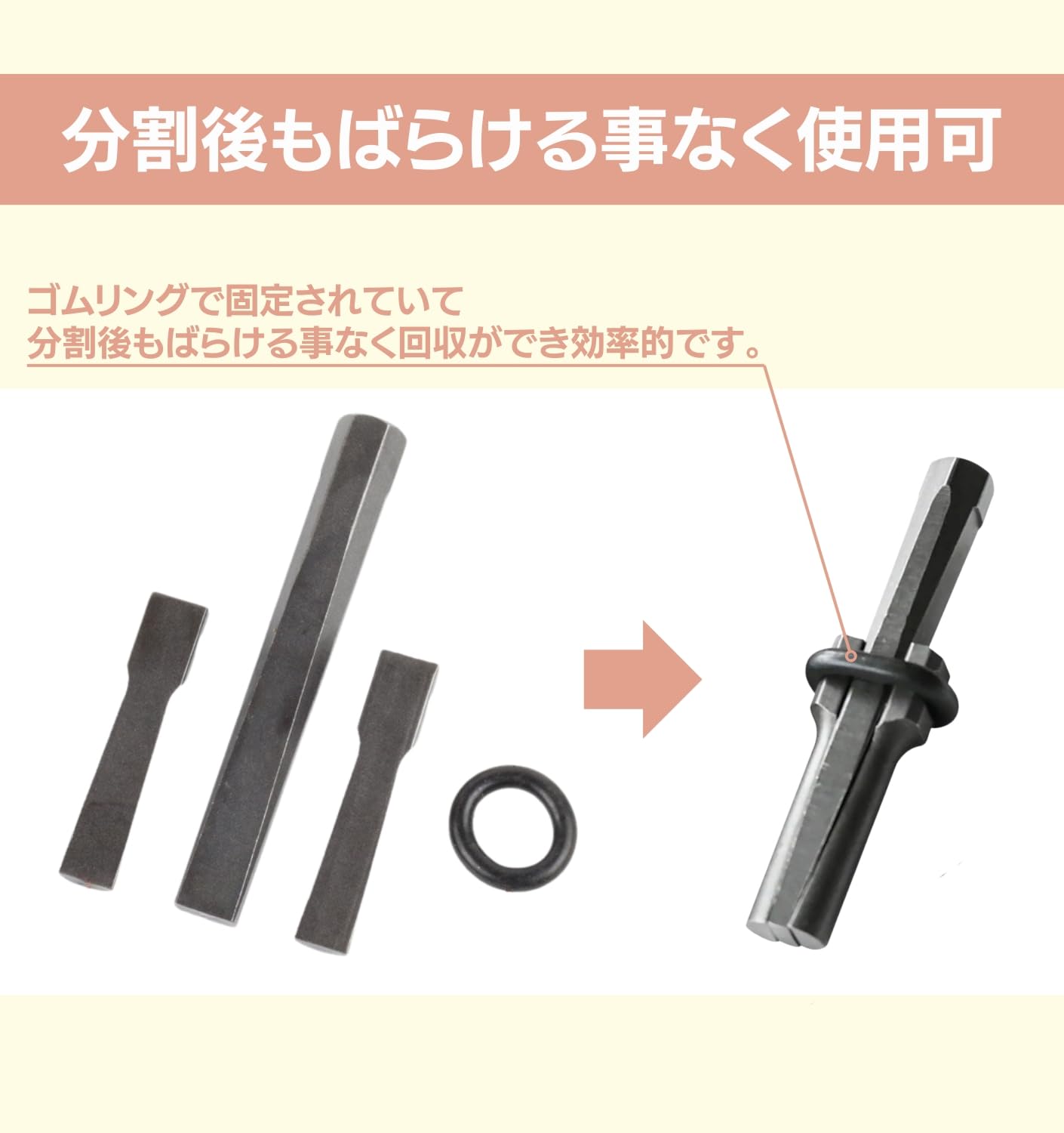 【セリ矢 ストーンスプリッター 14mm/16mm】石割り作業を簡単かつ効率的に!セリ矢は、石材やコンクリート、大理石、庭石撤去に最適。をスムーズに分割できる石割り道具です。庭石撤去や建設現場など、幅広い石材加工に対応します。DIY初心者さんからお使いいただけます。</br>【石を手早く分割】セリ矢を使うことで、岩石を素早く分割したり、小さくすることができます。</br>【ゴムリングで作業効率up】3本のクサビがゴムリングで固定されており、分割後もばらけることなく回収できて効率的です。効率が大幅にアップし、石頭ハンマーでの作業をスムーズに行えます。</br>【耐久性を追求した設計】高硬度スチール製で、強度と耐久性を実現。繰り返しの使用にも耐えられる長寿命設計です。錆びにくく、曲がりにくいため、長期間安心してご使用いただけます。</br>【2サイズ展開】サイズは直径14mmと16mmの2サイズ展開。全長105mmのコンパクト設計で、場所を取らないため、屋外での作業にも最適。手軽に持ち運べるため、様々な現場で活躍します。</br>【幅広い用途】大理石や庭石、コンクリートブロックの分割など、多用途に対応する石割り道具。DIYでの庭石撤去から専門的な石材加工まで、幅広くお使いいただけます。