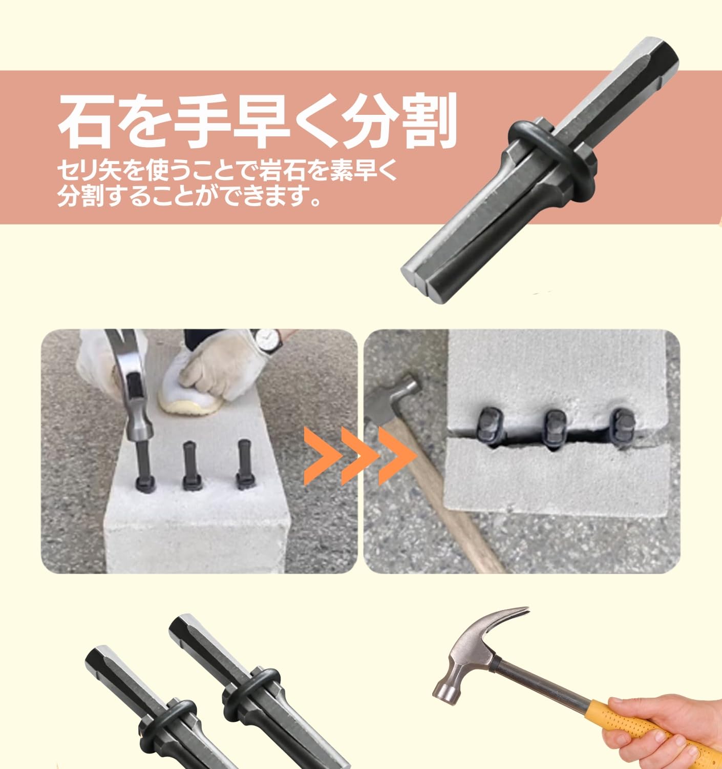 【素早く石を分割】セリ矢は、岩石やコンクリートを効率的に分割するための工具です。DIYや石工に最適で、簡単に石やコンクリートブロックを加工できます。適切な間隔で穴を開け、セリ矢を挿入してハンマーで叩くだけで素早く分割可能。3本のクサビがゴムリングで固定され、岩石分割後もばらけず、効率よく回収できます。14mmと16mmのサイズから、5本セットと10本セットも選べ、用途に合わせてお選びいただけます。