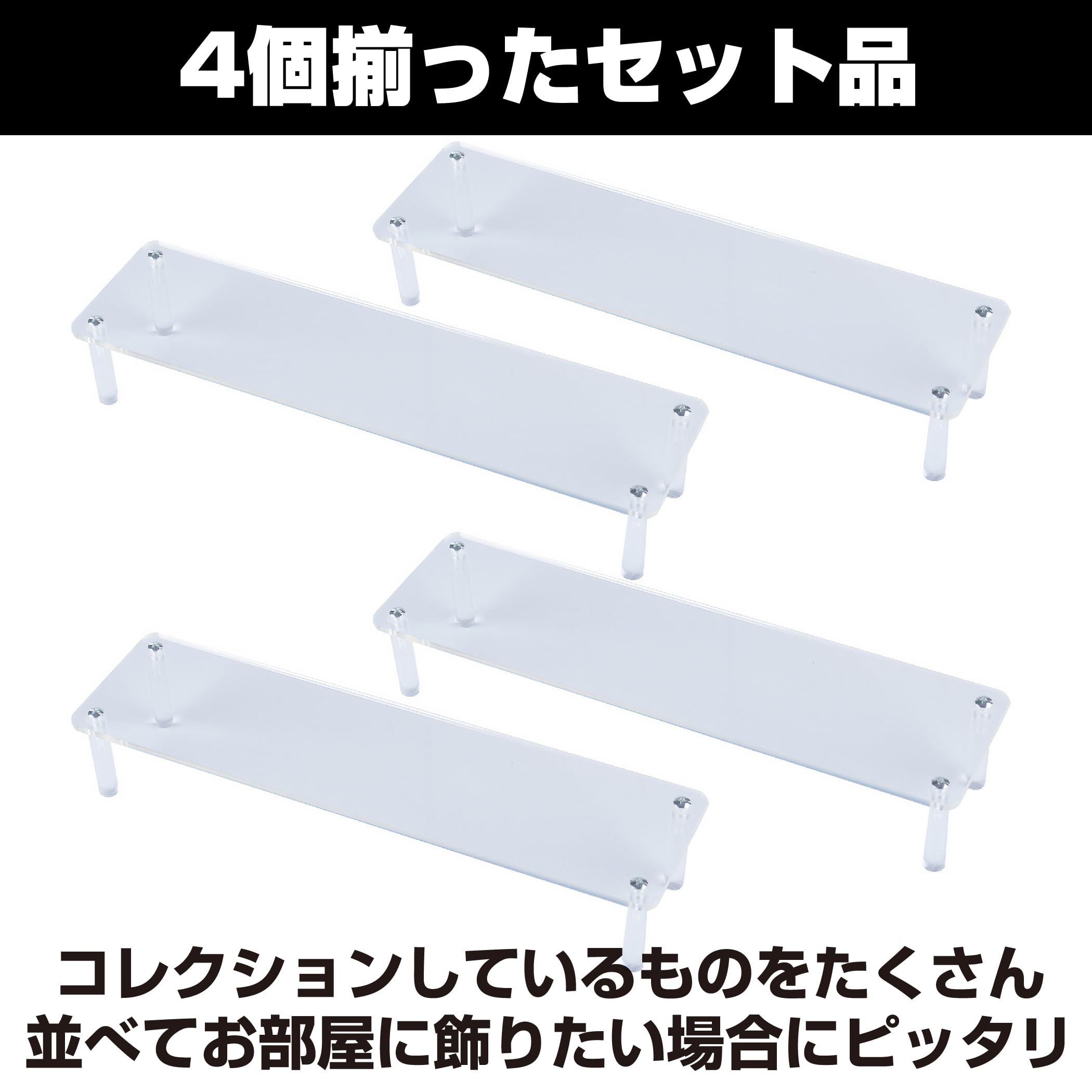 コレクションしているものがたくさんある場合におすすめ:1段タイプのアクリルディスプレイスタンドが4個揃ったセット品ですので、コレクションしているものをたくさん並べてお部屋に飾りたい場合にピッタリです。