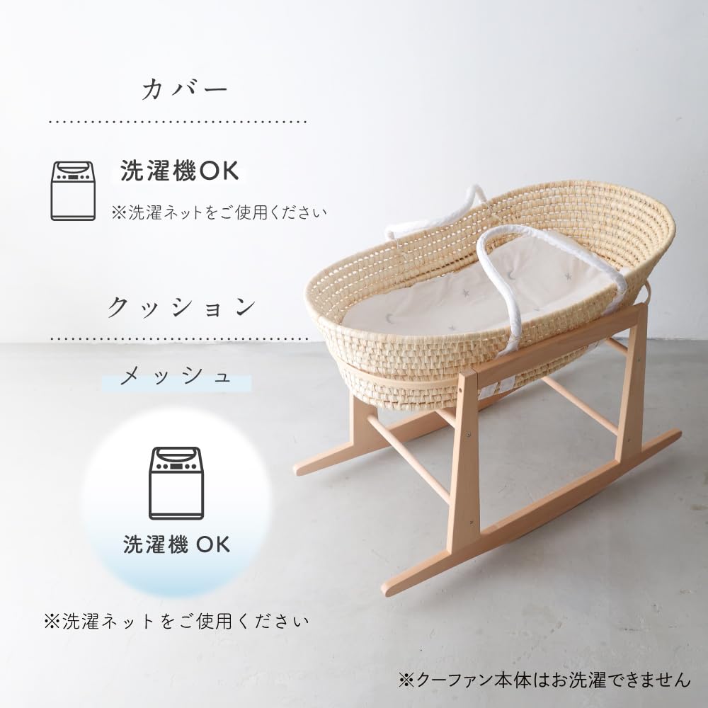 [注意事項]クーファンかご本体は一つ一つ手編みで生産しているため、多少サイズが異なることがございます。本製品での長時間の就寝はおやめください。ご使用の際は必ず保護者の方が付き添ってください。ご使用は連続使用時間1~2時間程度、1日あたり3~4時間程度を目安として、ベビーベッドとしての長時間の使用はおやめください。[製品カラー・サイズにつきまして]製造時期やロットにより、実際の商品と掲載写真のカラー(色味)が異なる場合がございます。また、お使いの端末やモニター環境によっても異なる場合がございます。製品サイズは、測り方や素材の特性などにより誤差や多少の個体差が生じる場合がございます。ご了承ください。