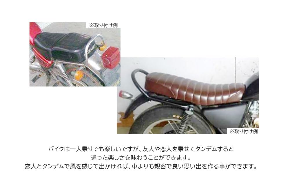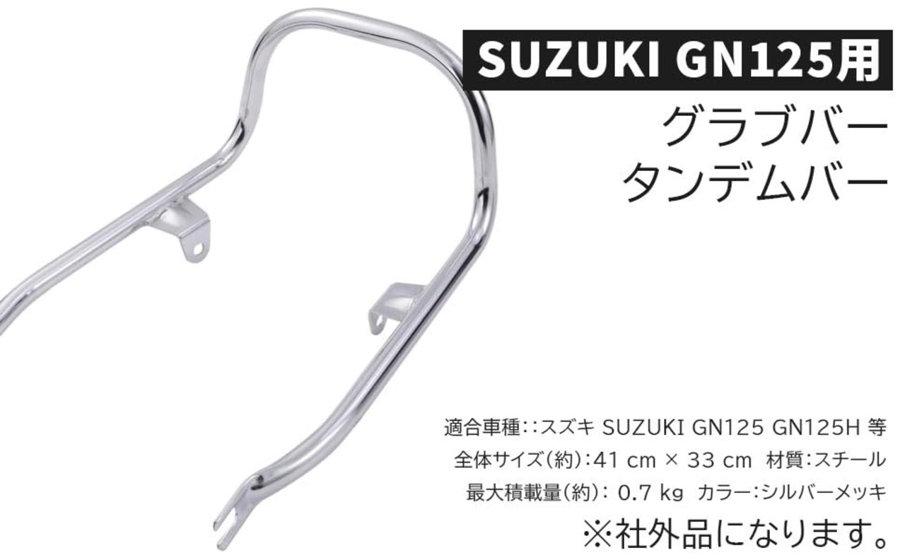 SUZUKI GN125 用 グラブバー タンデムバー の社外品になります。<br><br> 適合車種::スズキ SUZUKI GN125 GN125H 等 <br> 全体サイズ(約):41 cm × 33 cm 材質:スチール <br> 最大積載量(約): 0.7 kg カラー:シルバーメッキ<br><br> 取り付けると手放せなくなるほど便利なのが、バイクのグラブバーです。<br><br> バイクは一人乗りでも楽しいですが、友人や恋人を乗せてタンデムすると違った楽しさを味わうことができます。<br><br> 恋人とタンデムで風を感じて出かければ、車よりも親密で良い思い出を作る事ができます。<br><br> バイクは元々たくさんの荷物を運ぶ乗り物ではありませんが、グラブバーを取り付けることで荷物も積載できるようになります。<br><br> ちょっとした買い物やツーリングでも、グラブバーとロープ、ネットがあると安全に荷物を積むことができ重宝します。<br><br> シルバーメッキのグラブバーを取り付ける事により引き締まって、バイクのスタイルもオシャレにカッコよく見えるドレスアップ効果もあります。<br><br> バイクキャンプを楽しむライダーも増えていますが、道具一式を積む土台にもなり、ロングツーリングも楽しむことができます。<br><br> グラブバーが自分のバイクに付いてない…と嘆いている方、僅か数千円で楽しいバイクライフの幅が広がります。<br><br> 荷物を積める実用性もあり楽にタンデムも可能な、オシャレでドレスアップ効果もあるグラブバーは取り付けて後悔はしないオススメのパーツです。<br><br> ※取扱説明書は付属しておりません。<br><br> ※取り付け用 ビス・ナット等は別途ご用意ください。<br><br> ※車両により個体差のある場合がありますので、取り付けに加工を要する事があります。<br><br> ※取り付けに関するサポート及びお問い合わせの対応はしておりませんのでご了承お願い致します。<br><br> ※取り付けに自信のない方は専門の業者様、または整備士に依頼して取付けされることをお薦め致します。<br><br>