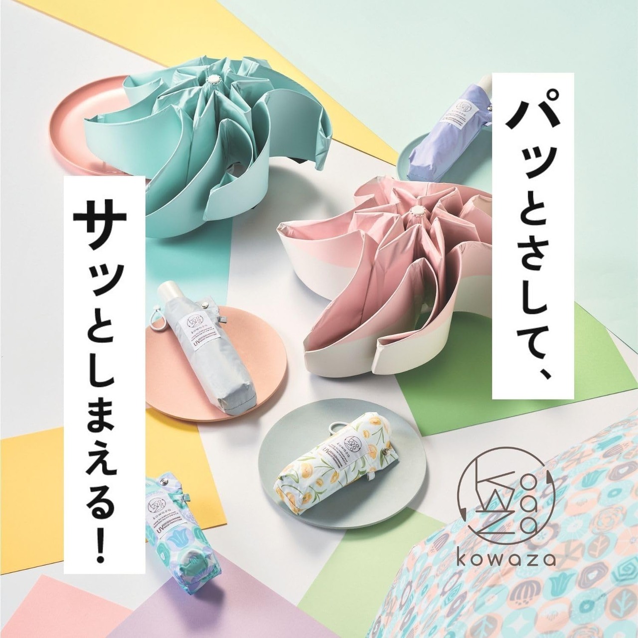 「3秒でたためる傘 urawaza(ウラワザ)」のシリーズから、よりコンパクトサイズになった「パッとさしてサッとしまえる」kowaza(コワザ)が登場。ウラワザは折り畳み傘の煩わしさを解消する構造の傘で、世界初の形態安定技術の採用により、誰でも・すばやく・きれいに折りたたむことができます。その秘密は、傘の裏側に貼られた特殊な形状のPET樹脂シート。透明な特殊シートが畳む際にガイドの役割を果たし、スムーズに折しわを再現することで、生地を軽く振るだけで簡単に畳めます。遮熱・遮光100%・UVカット機能が付いて、雨の日も使用OK。晴雨兼用なので毎日お使いいただけます。収納時は約17cmでコンパクトなので旅行や常備傘にもおすすめです。年代を選ばないシンプルなデザインで、プレゼントとしても嬉しいアイテムです。