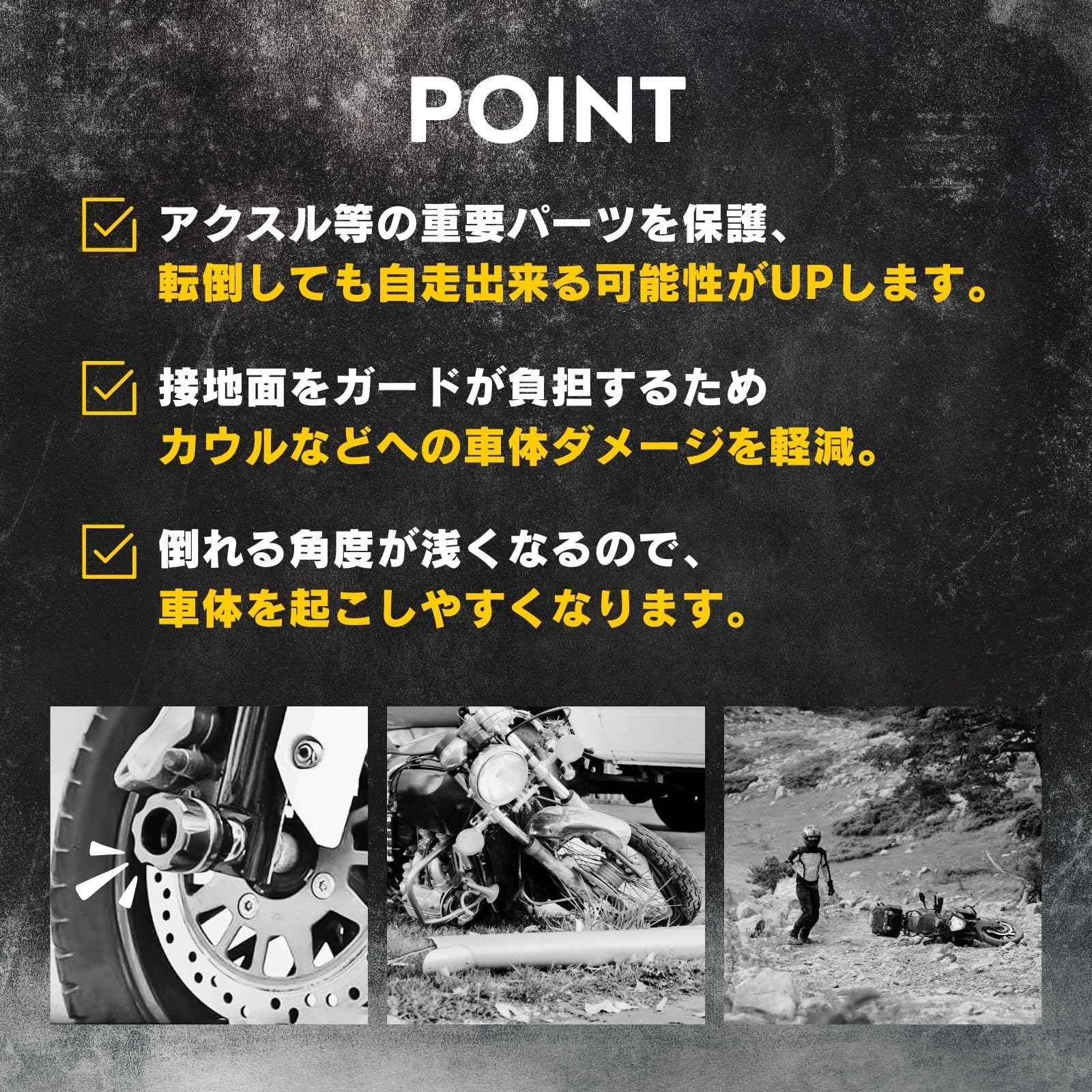 アクスルシャフトの保護機能を備え、タイヤ交換を容易にし、レーシングスタンドの受け代わりとしての使用も可能です。ドレスアップ用途にも適しており、バイクのスタイリングに一役買います。