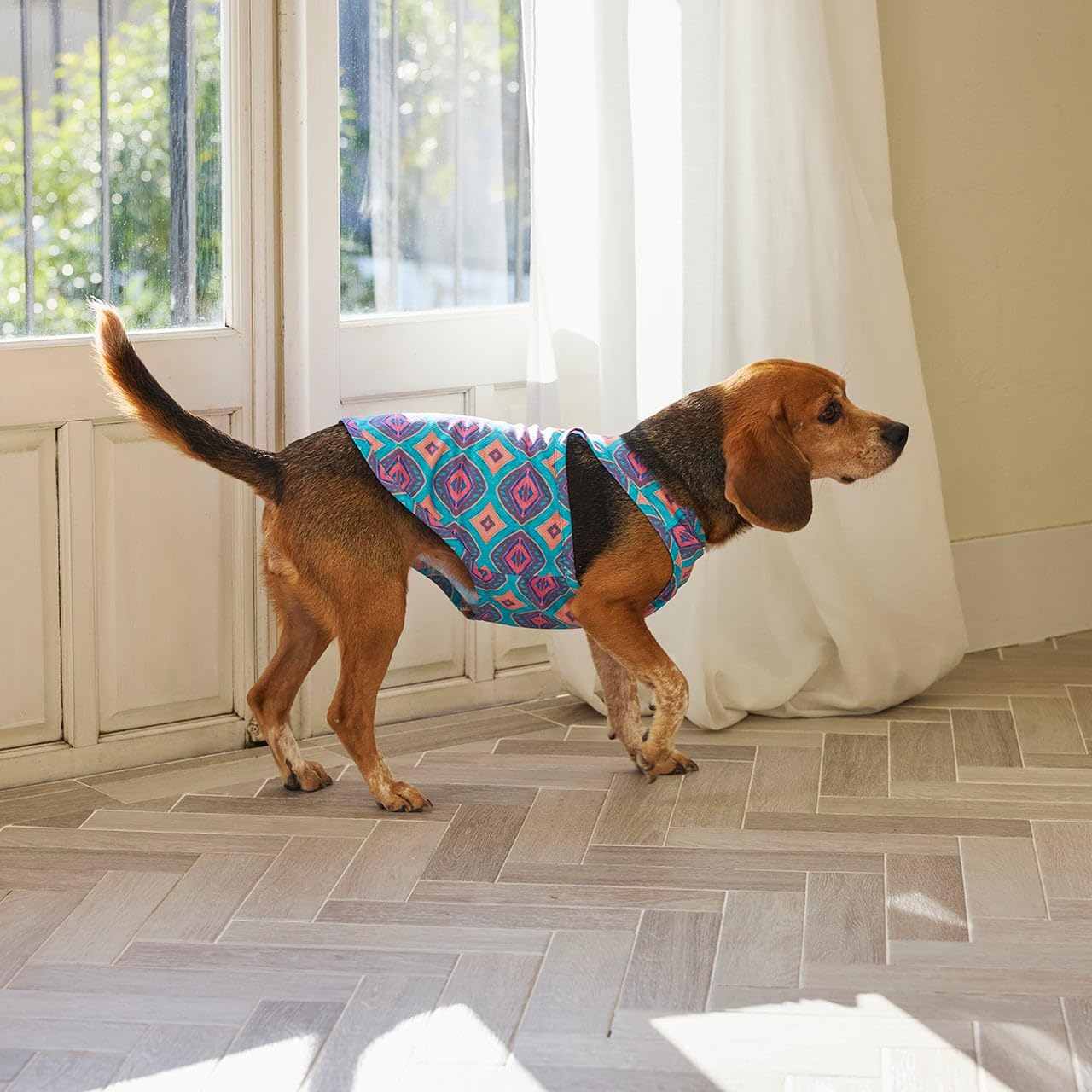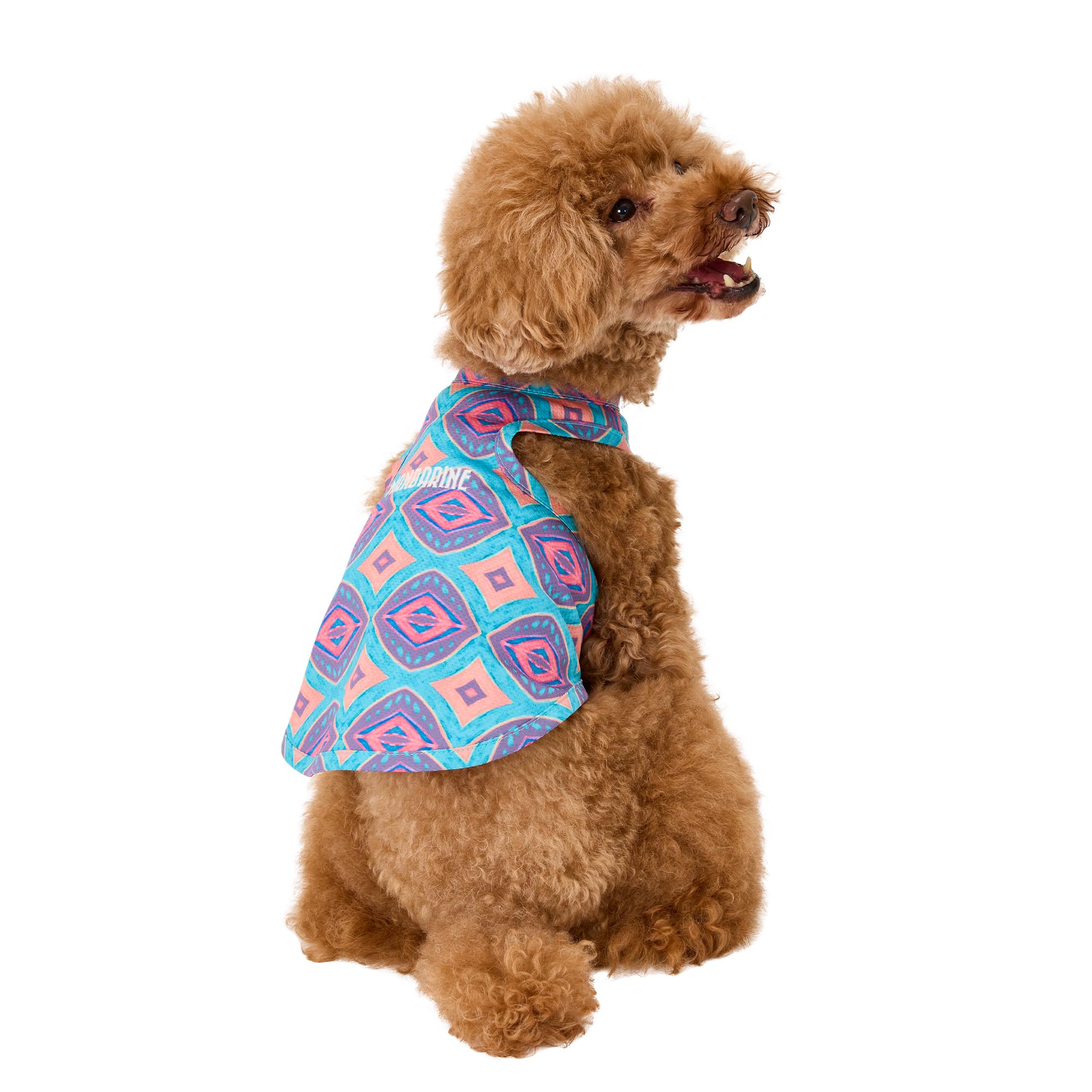 濡らして絞って振るだけでひんやり爽快! 愛犬を熱中症から守る冷却素材でアクティブなワンちゃんにオススメです。 夏を感じる総柄プリントの背中には紫外線に当たると色が変わるロゴ刺繍。 夏を快適に過ごしながら視覚的にも楽しめる1着です。 ちょっぴり短めの丈感がオシャレなリニューアルアイテムです。 ネッククーラー(別売り)とのコーディネートもオススメです!