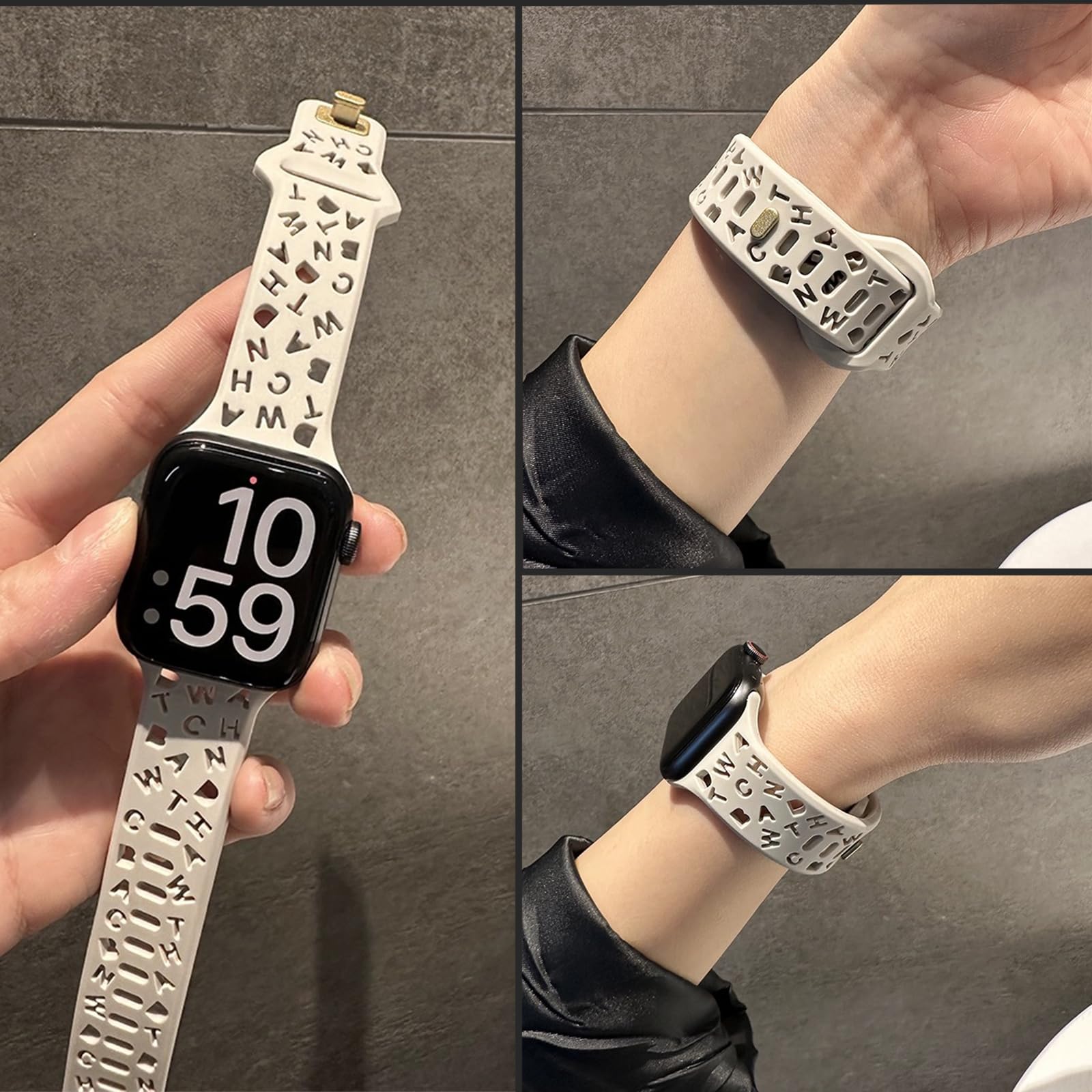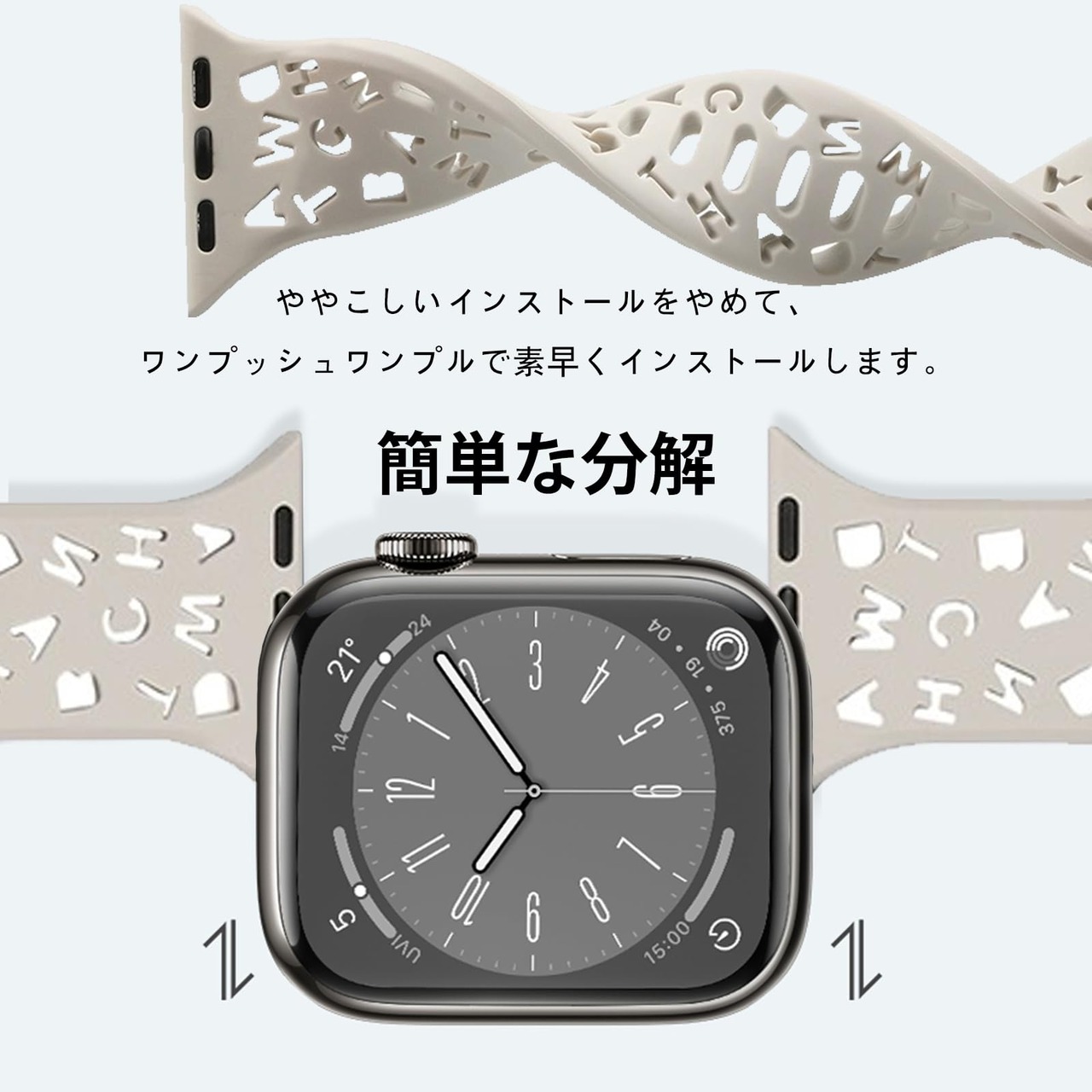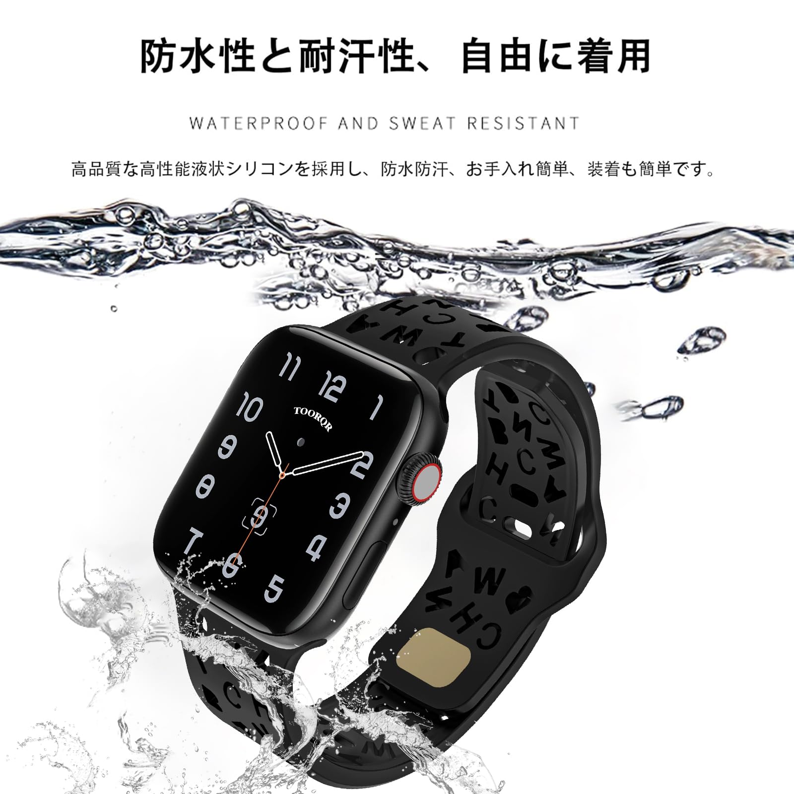 【プレミアムシリコン材料】Apple Watchに対応した高品質英字スタイルの中空デザイン、エコ素材を使用して精巧に作られた。Apple Watch シリコンバンドの素材は肌に優しい高品質ソフトシリコン素材です。とても柔らかく、快適で耐久性があります、水洗いができます。お客樣に素晴らしい着用体験をもらいます。