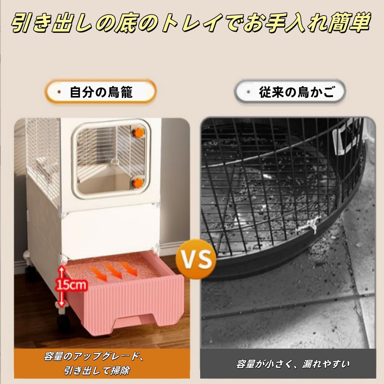 製品説明<br> 名称: 給餌ケージ<br> <br> 広々として快適:小型または中型の鳥を複数飼育できる大型の鳥かごです。カナリア、オウム、インコ、オカメインコなど、多くの鳥を飼うこともできます。スペースは広々としており、混雑している感じは全くありません。<br> お手入れ簡単:ケージの隅々までお手入れできます。トレイは底から素早く引き出せ、丸洗いもできるのでお手入れも簡単!<br> 移動が簡単: ユニバーサルホイールが付いているので、好きな場所に簡単に移動できます。スタイリッシュなデザインはどんなインテリアにも簡単に溶け込みます。<br> 高めのガードレール:17CMのガードレールが食べ物の飛び散りを効果的に防ぎます。<br> ご注意ください:<br> ● 手作業による測定方法の違いにより、誤差は1〜2cmとなります。<br> <br> ● 写真はできる限り実際の商品に近くなるよう努力しておりますが、照明、コントラスト、カラーモニターにより色の違いが生じる場合がございます。