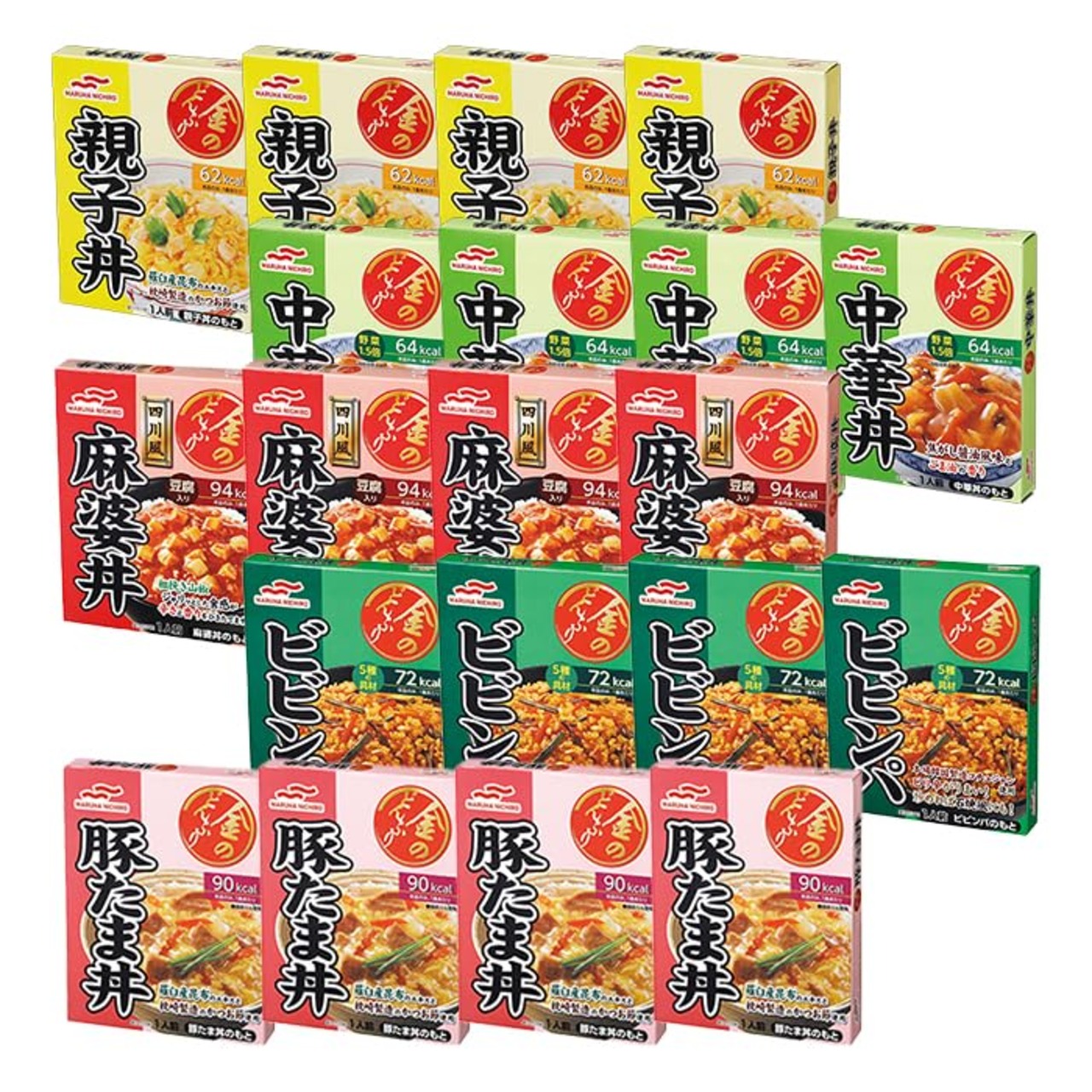 セット内容 5種×4個 親子丼:140g 中華丼:140g 四川風麻婆丼:140g 本場韓国製造コチュジャンビビンパ:100g 豚たま丼:140g