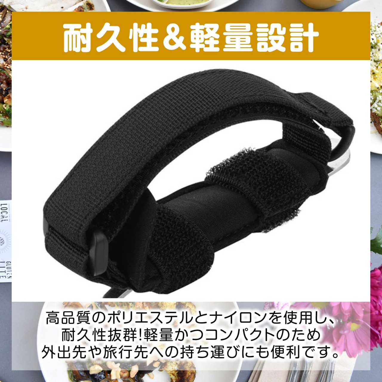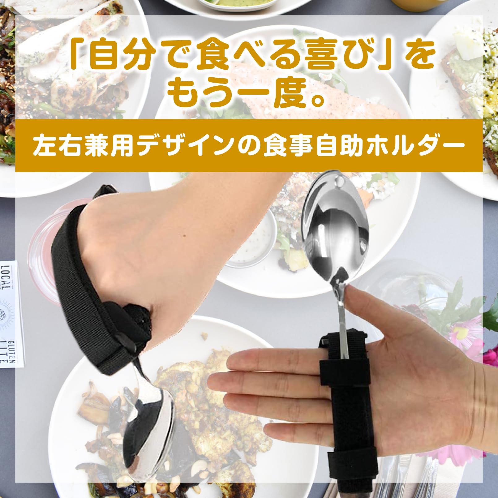 【SATOMO 自助具 ホルダー 食事補助 便利グッズ 介護用品 スプーン フォーク 箸 食器用 滑り止め 調節可能 2個セット】 <br><br>商品ページをご覧頂き、誠にありがとうございます。 <br><br>「自分で食べる喜び」をもう一度。左右兼用デザインの食事自助ホルダーです。お手持ちのスプーンやフォークなどを取り付けるだけ♪握力が弱い方や介護が必要な方の「自分で食べる」をサポートします。 <br><br>【握りやすさを追求】滑り止め効果のある設計で、スプーンやフォークをしっかり固定。食器が安定し、食事を口に運びやすい♪ご高齢者や要介護者、リハビリ中の方などにおすすめです。 <br><br>【使い方簡単】スプーンやフォーク、歯ブラシ、ペンなど持ちたいものをマジックテープで固定し、手に取り付けるだけ!調節可能ストラップで、手にしっかりフィット!通気性が良く、柔らかな触り心地です。 <br><br>【耐久性&軽量設計】高品質のポリエステルとナイロンを使用し、耐久性抜群!軽量かつコンパクトのため外出先や旅行先への持ち運びにも便利です。幅広いシーンでご活用ください。 <br><br>【商品詳細】セット内容:1個または2個セット カラー:ブラック サイズ:約8~13cm、幅約3.5cm 材質:ポリエステル、ナイロン <br><br>※モニターの環境により色の見え方に若干差が生じる場合がございます。