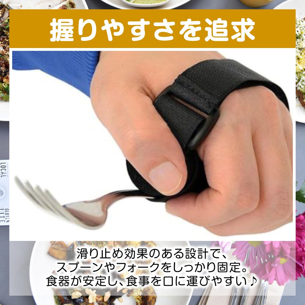 【使い方簡単】スプーンやフォーク、歯ブラシ、ペンなど持ちたいものをマジックテープで固定し、手に取り付けるだけ!調節可能ストラップで、手にしっかりフィット!通気性が良く、柔らかな触り心地です。