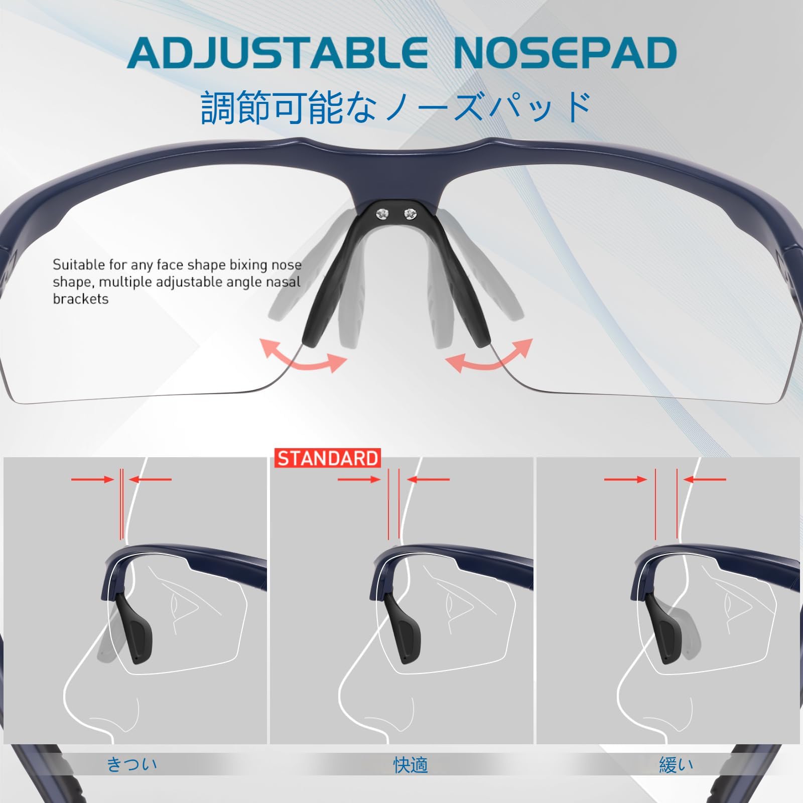 【調整可能なノーズパッド & 完璧なフィット感】このスポーツサングラスは、調整可能なノーズパッドを採用しており、どんな顔の形にもぴったりフィットします。長時間の使用でも快適で、サイクリングやランニングのような激しい運動でもずれずにしっかりと固定されます。さらに、軽量設計により、負担なく快適にご使用いただけます。