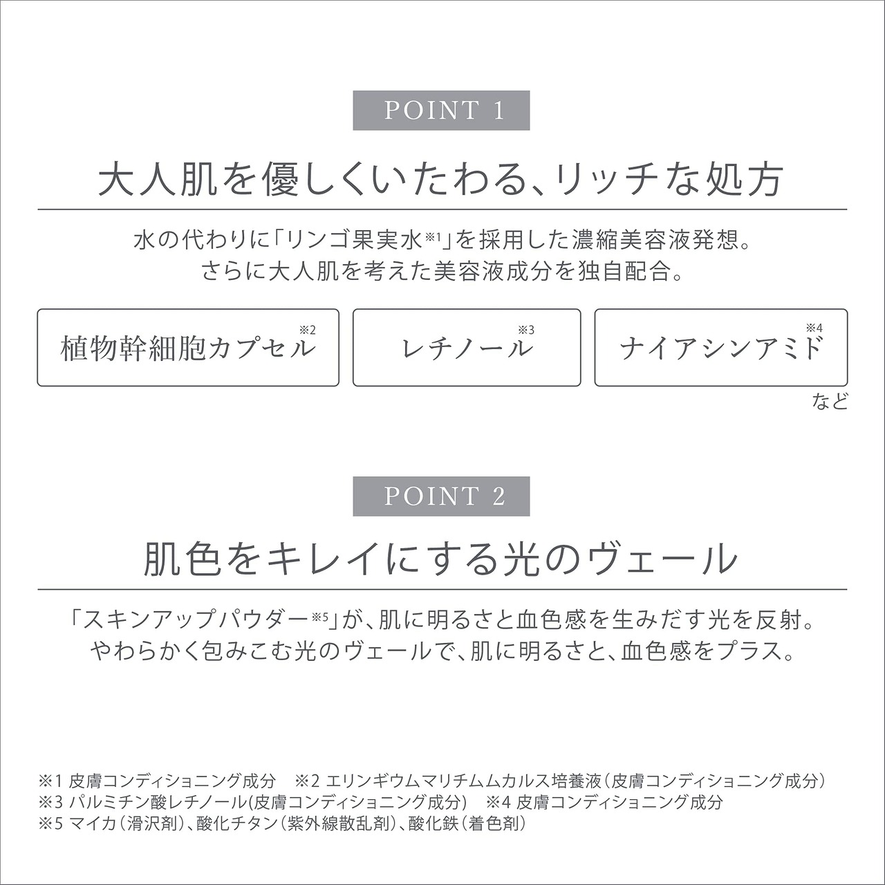 【全成分】リンゴ果実水、シクロペンタシロキサン、酸化チタン、トリメチルシロキシフェニルジメチコン、BG、酸化亜鉛、PEG-10ジメチコン、ペンチレングリコール、セスキイソステアリン酸ソルビタン、オレイン酸ソルビタン、水酸化Al、スピルリナマキシマエキス、エリンギウムマリチムムカルス培養液、アセチルヒアルロン酸Na、加水分解ヒアルロン酸、ヒアルロン酸Na、ヒアルロン酸ジメチルシラノール、スクワラン、ポリクオタニウム-61、加水分解卵殻膜、コルクガシ樹皮エキス、(メタクリル酸グリセリルアミドエチル/メタクリル酸ステアリル)コポリマー、パルミチン酸レチノール、ナイアシンアミド、グリチルリチン酸2K、ユビキノン、アンズ核油、コーン油、グリセリン、エチルヘキシルグリセリン、ヒドロキシアパタイト、トマト果実/葉/茎エキス、ローズマリー葉エキス、ヒマワリ種子油、アルギン酸Ca、アラントイン、イソステアリン酸、レシチン、メチコン、炭酸プロピレン、硫酸Mg、カプリル酸グリセリル、ジミリスチン酸Al、DPG、パルミチン酸エチルヘキシル、塩化Na、アルミナ、ラウロイルリシン、ジステアルジモニウムヘクトライト、窒化ホウ素、シリカ、含水シリカ、ジメチルシリル化シリカ、スクロース、酢酸セルロース、フェノキシエタノール、トコフェロール、マイカ、タルク、合成フルオロフロゴパイト、ハイドロゲンジメチコン、酸化鉄