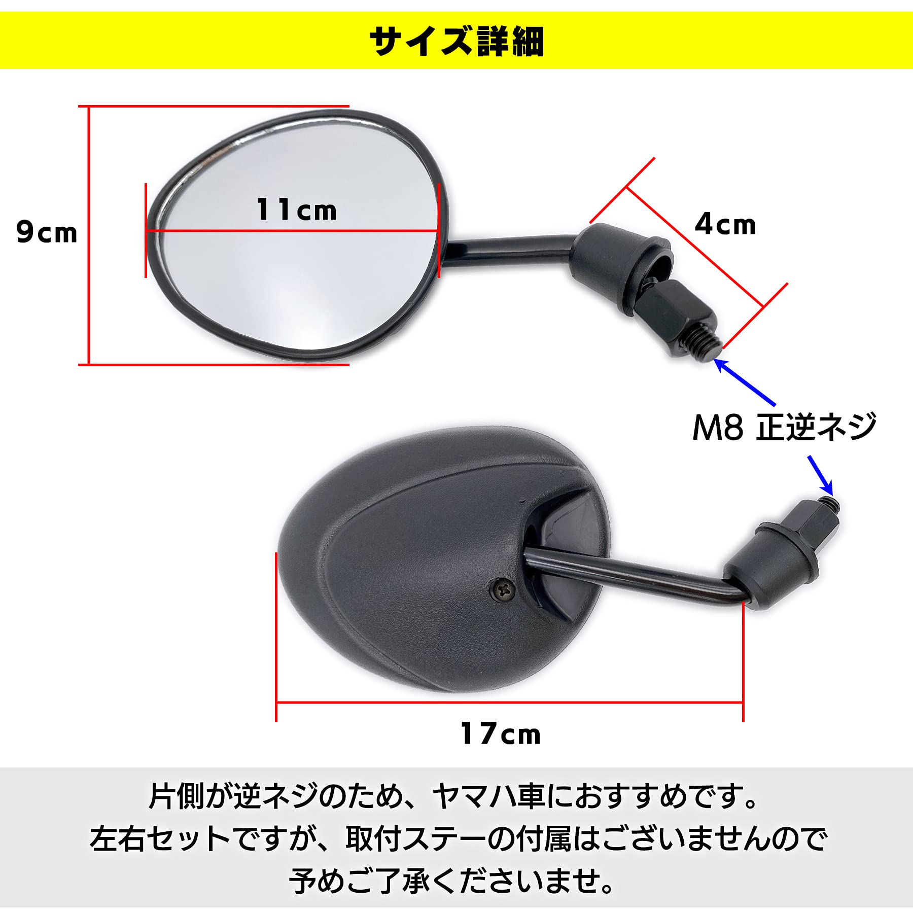 スタイリッシュで実用的なショートミラーです。 小型なので狭い道もすり抜けしやく、曲面鏡を採用しているので視界も広く使いやすいです。 ドレスアップとしてもオススメですが、 補修、予備パーツとしても使える汎用タイプなので1セット持っておくと便利です。 正逆でM8ネジになります。 【取り付け車種一例】 シグナスx bw's jog ビーノ マジェスティ nmax vox など。 ※車種によってはアダプター当が必要になる場合があるので必ず形状やサイズをご確認ください。