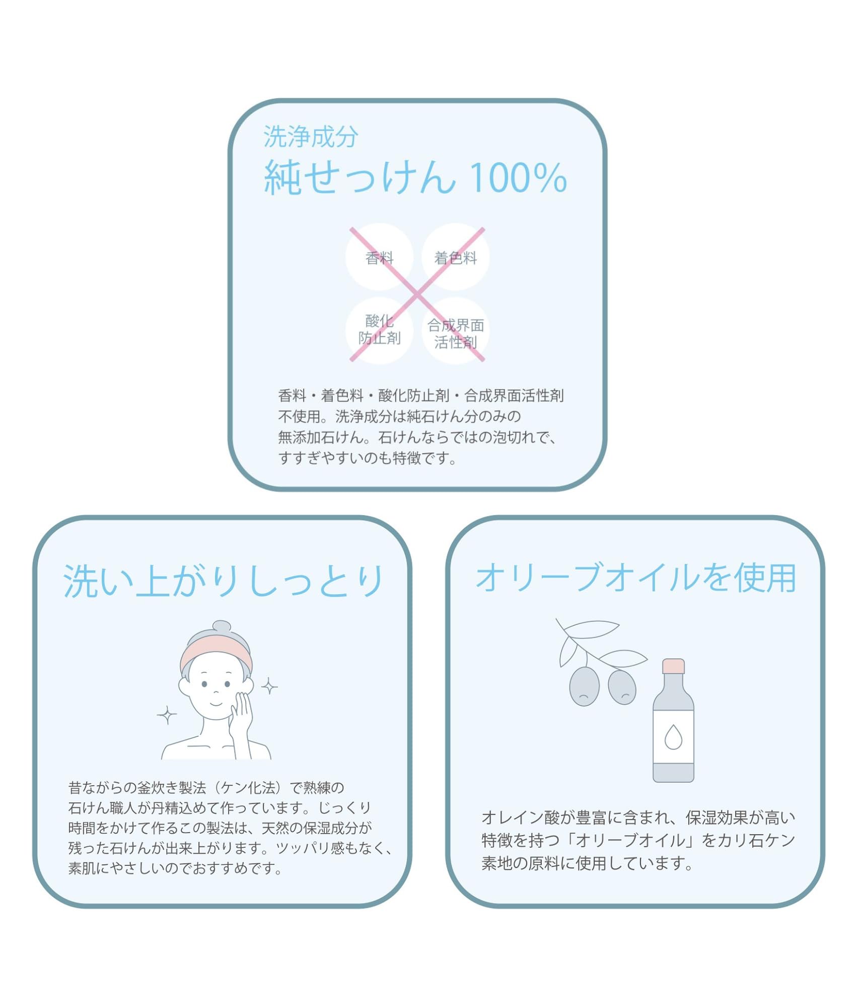 ・オレイン酸が豊富に含まれ、保湿効果が高い特徴を持つオリーブオイルをカリ石けん素地の原料に使用。