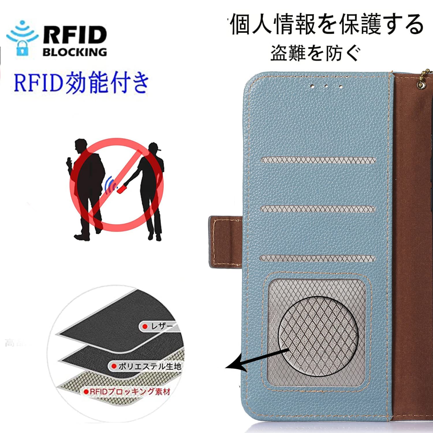 【RFID技術採用】先進的なRFIDセキュア技術を利用して、信号をブロックして、ICカードの情報や個人情報などを安全に守ります。★信号がブロックするから、カードをケースに入れたまま反応しない場合は、カードを取り出してご利用ください。