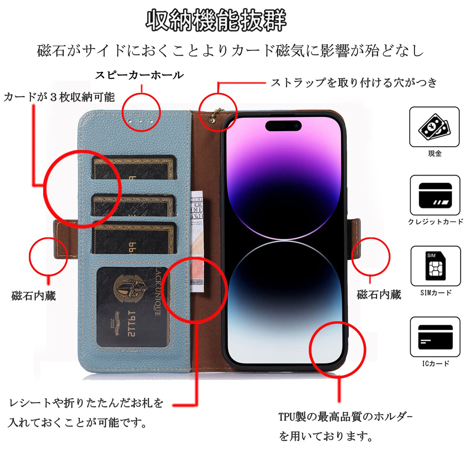 【多機能:収納機能、横置きスタンド】①内側に実用性のカード入れポケット×3、内側ポケット×1、カード類、ポイントカードなどを収納でき、通勤も通学にも楽々タイプです。②横置きスタンド機能が付きまして、背面を折り曲げて立て掛けるだけでケースがそのままスタンドにしますが、好きな角度を調節できて、手放しでも動画視聴や読書に楽しめる。③マグネットが内蔵されているので、ベルトがなくてもフタがぴったり閉まります。