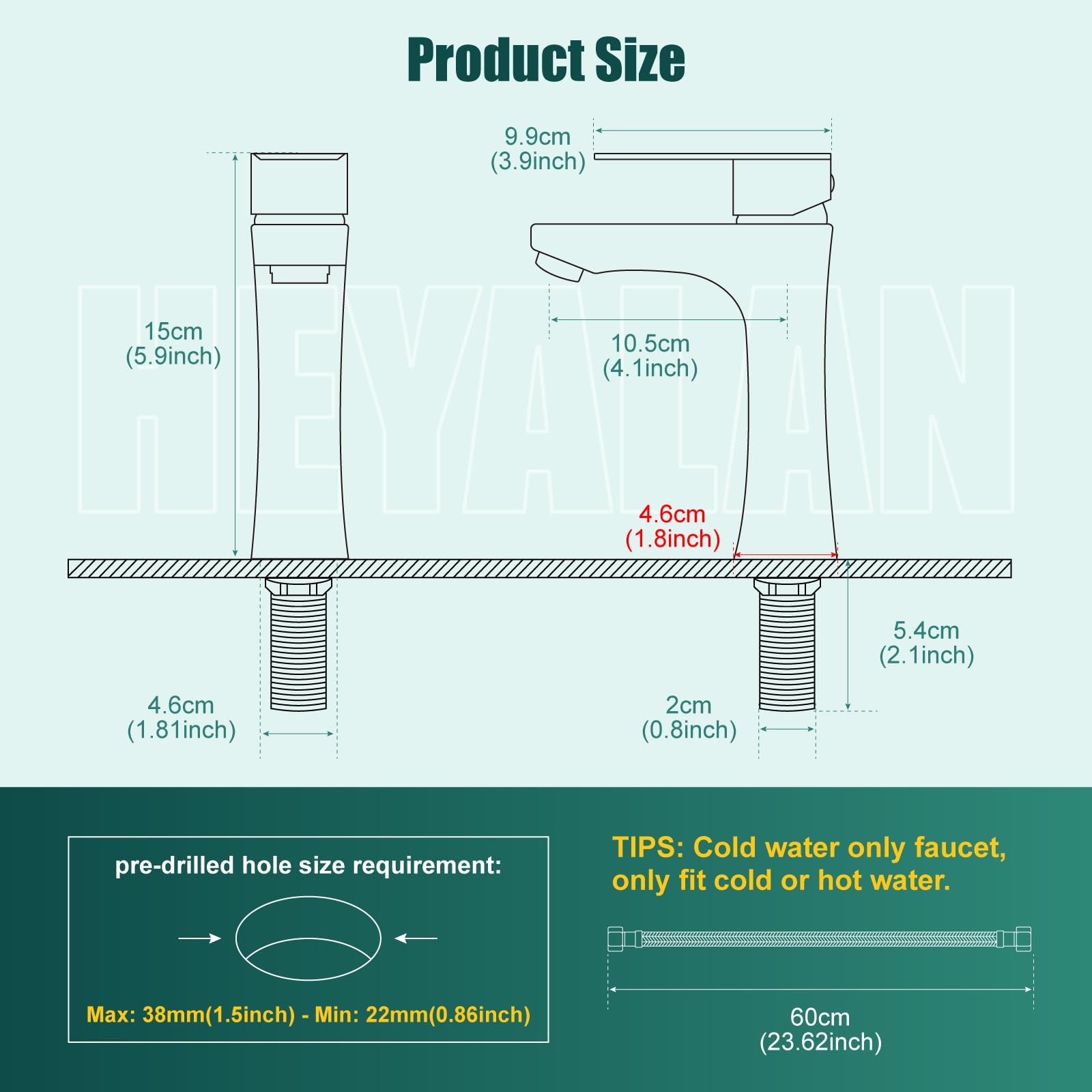 <ul><li>構造: シングルレバー浴室用蛇口。業務用SUS 304ステンレススチール。優れた耐腐食性と防錆仕上げ。 </li></ul><ul><li>特徴: 冷水蛇口は、2.4インチまで延長されたネジパイプのみで、あらゆる長さのコネクタに便利に取り付けることができます。すべてのコネクタは米国標準3/8インチねじです。また、オス3/8インチ - メス1/2インチアダプターが付属しています。 </li></ul><ul><li>デザイン: シングルレバーで流れや温度調節が簡単。 1つの穴で1つの穴にフィットします (デッキプレートは含まれません)。 </li></ul><ul><li>取り付け:シングルホールデッキマウントシンク蛇口、簡単なインストール、60cmのウォーターホース。シンクの穴の直径は20mm~39mmにしてください。 </li></ul><ul><li>取り付け簡単: シングル冷水蛇口には、取り付けアクセサリーと取扱説明書が付属しています。 </li></ul>