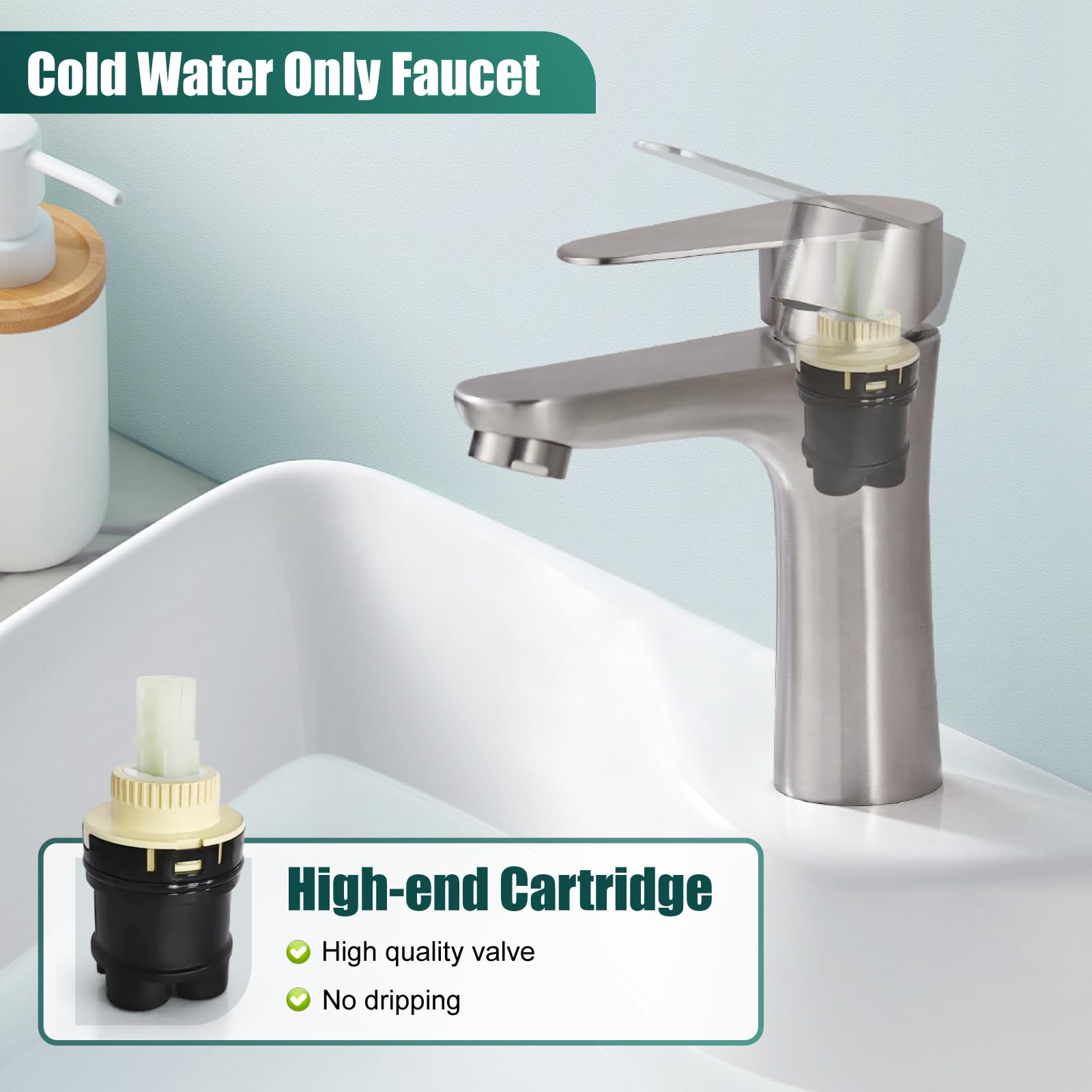 つや消しニッケル バスルーム蛇口 冷水のみ SUS304 ステンレススチール シングルハンドル 1穴デッキマウント 洗面所タップ シングルスイッチ 3/8インチホース オス 3/8インチ - メス 1/2インチアダプター (雨は含まれません)