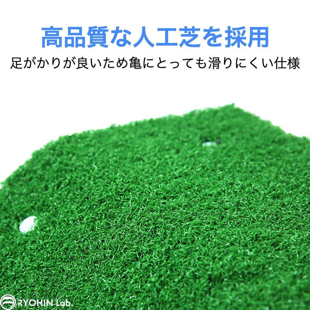 【高品質な人工芝を採用】日なたぼっこ台の表面に綺麗でナチュラルな人工芝が備わっています。亀の水槽をよりナチュラルに彩ってくれてとてもオシャレです。足がかりが良いため亀にとっても滑りにくく、登りやすいスロープ仕様です。※初めは芝が落ちやすい場合がありますので、余分な芝をよく払ってからのご使用をおすすめします。